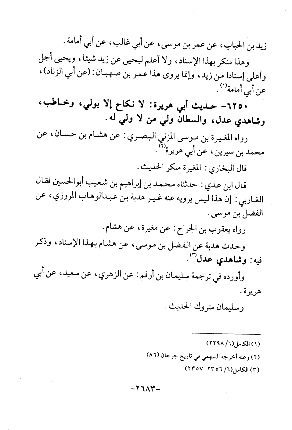 6250 - حَدِيث أبي هُرَيْرَة: لَا نِكَاح إِلَّا بولِي، وخاطب، وشاهدي عدل، وَالسُّلْطَان ولي من لَا ولي لَهُ. رَوَاهُ الْمُغيرَة بن مُوسَى الْمُزنِيّ الْبَصْرِيّ: عَن هِشَام بن حسان، عَن مُحَمَّد بن سِيرِين، عَن أبي هُرَيْرَة. قَالَ البُخَارِيّ: الْمُغيرَة مُنكر الحَدِيث. قَالَ ابْن عدي: حدّثنَاهُ مُحَمَّد بن إِبْرَاهِيم بن شُعَيْب أَبُو الْحُسَيْن فَقَالَ الغاربي: إِن هَذَا لَيْسَ يرويهِ عَنهُ غير هدبة بن عبد الْوَهَّاب الْمروزِي، عَن الْفضل بن مُوسَى. رَوَاهُ يَعْقُوب بن الْجراح: عَن مُغيرَة، عَن هِشَام. وَحدث هدبة عَن الْفضل بن مُوسَى، عَن هِشَام بِهَذَا الاسناد، وَذكر فِيهِ: وشاهدي عدل. وَأوردهُ فِي تَرْجَمَة سُلَيْمَان بن أَرقم: عَن الزُّهْرِيّ، عَن سعيد، عَن أبي هُرَيْرَة. وسيلمان مَتْرُوك الحَدِيث.