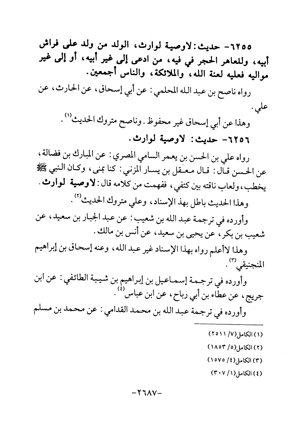 6255 - حَدِيث: لَا وَصِيَّة لوَارث، الْوَلَد من ولد على فرَاش أَبِيه، وللعاهر الْحجر فِي فِيهِ، من ادّعى إِلَى غير أَبِيه، أَو إِلَى غير موَالِيه فَعَلَيهِ لعنة الله، وَالْمَلَائِكَة، وَالنَّاس أَجْمَعِينَ. رَوَاهُ نَاصح بن عبد الله المحلمي: عَن أبي إِسْحَاق، عَن الْحَارِث، عَن عَليّ. وَهَذَا عَن أبي إِسْحَاق غير مَحْفُوظ. وناصح مَتْرُوك الحَدِيث.