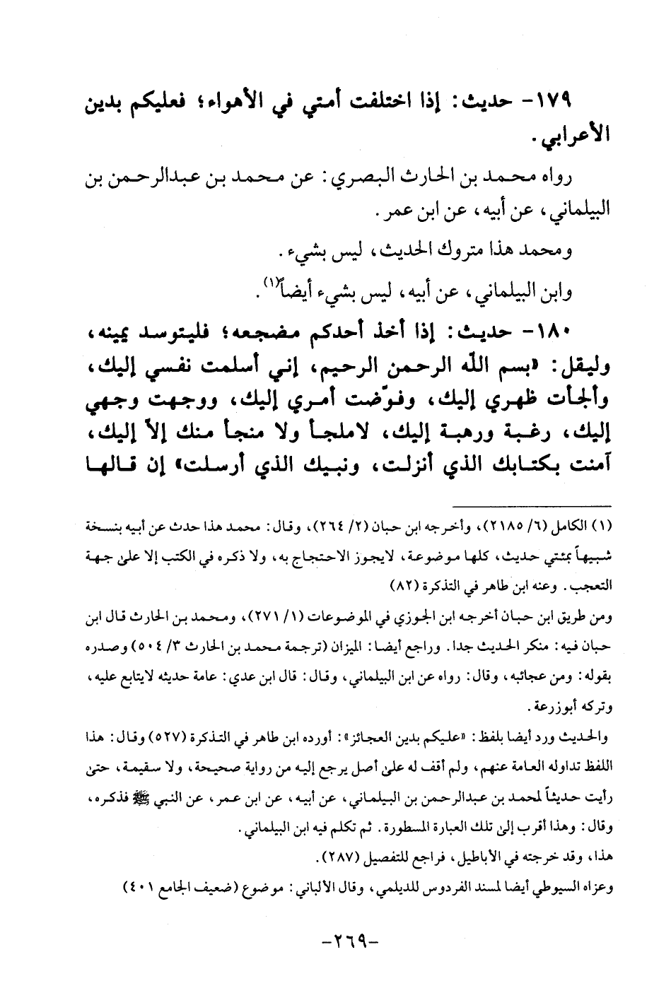 179 - حَدِيث: إِذا اخْتلفت أمتِي فِي الْأَهْوَاء، فَعَلَيْكُم بدين الْأَعرَابِي. رَوَاهُ مُحَمَّد بن الْحَارِث الْبَصْرِيّ: عَن مُحَمَّد بن عبد الرَّحْمَن بن الْبَيْلَمَانِي، عَن أَبِيه، عَن ابْن عمر. وَمُحَمّد هَذَا مَتْرُوك الحَدِيث، لَيْسَ بِشَيْء. وَابْن الْبَيْلَمَانِي، عَن أَبِيه، لَيْسَ بِشَيْء أَيْضا.