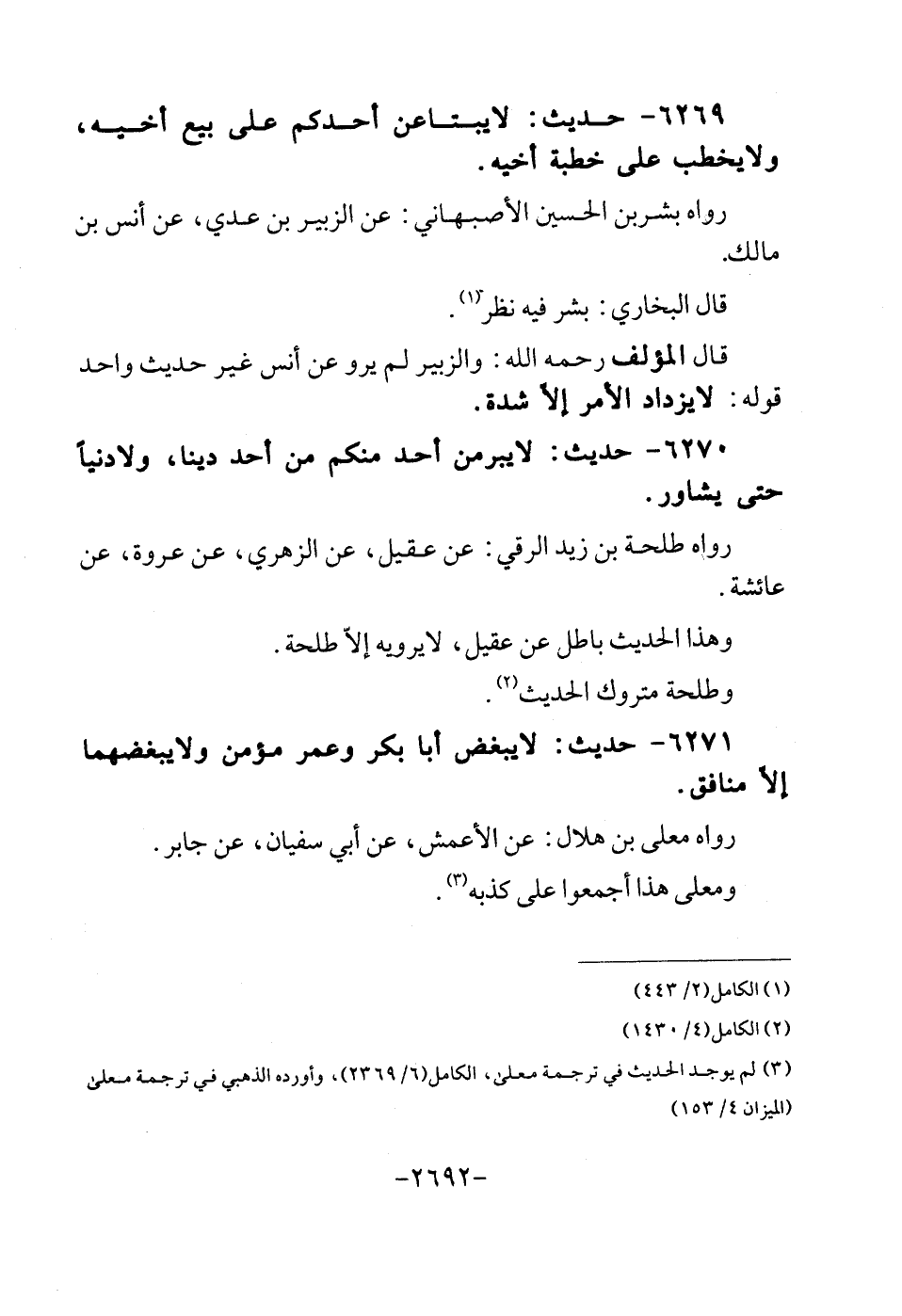 6269 - حَدِيث: لَا يبتاعن أحدكُم على بيع أَخِيه، وَلَا يخْطب على خطْبَة أَخِيه. رَوَاهُ بشر بن الْحُسَيْن الْأَصْبَهَانِيّ: عَن الزبير بن عدي، عَن أنس بن مَالك. قَالَ البُخَارِيّ: بشر فِيهِ نظر. قَالَ الْمُؤلف رَحمَه الله: وَالزُّبَيْر لم يرو عَن أنس غير حَدِيث وَاحِد قَوْله: لَا يزْدَاد الْأَمر إِلَّا بِشدَّة.
