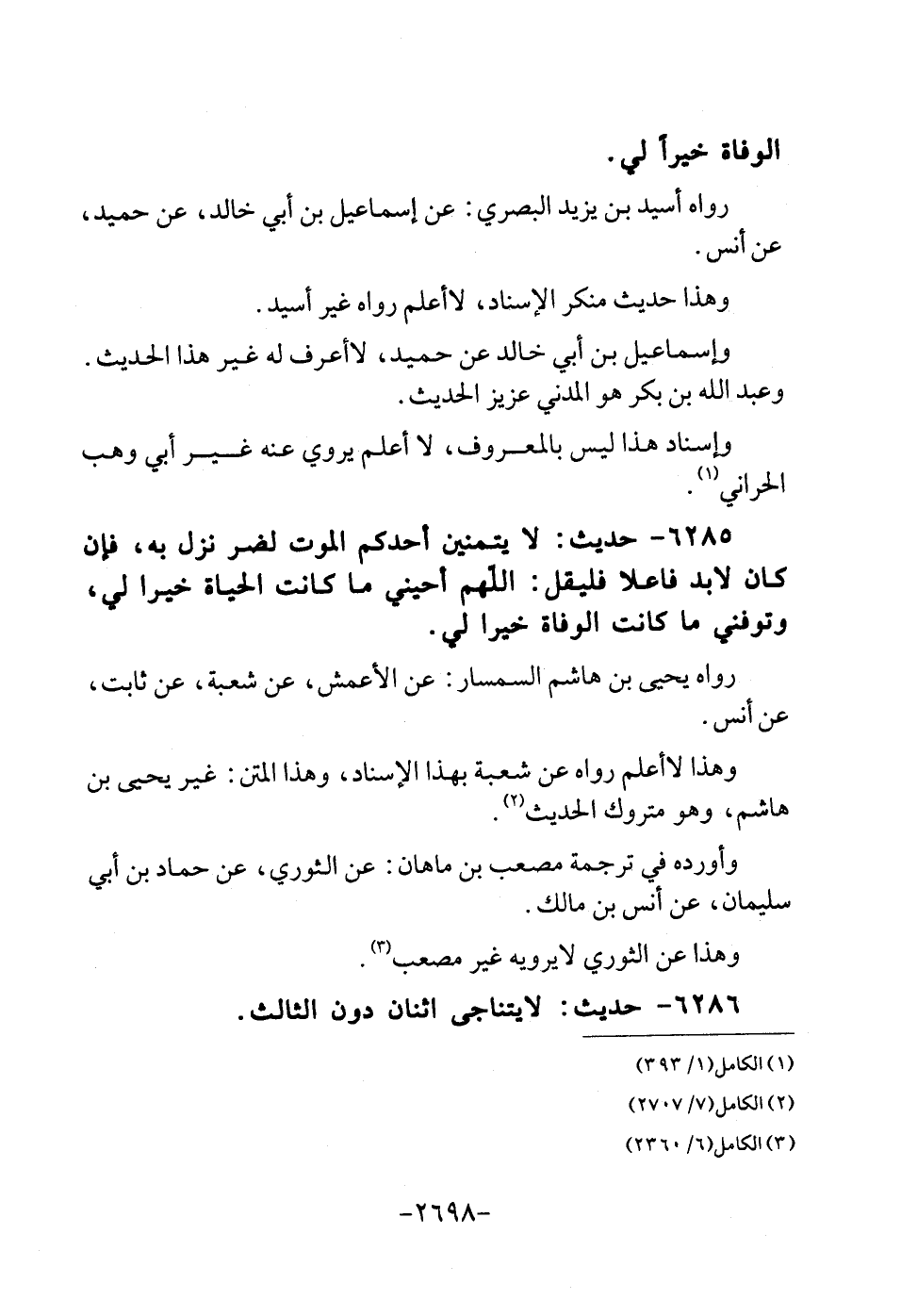 6285 - حَدِيث: لَا يتمنين أحدكُم الْمَوْت لضر نزل بِهِ، فَإِن كَانَ لَا بُد فَاعِلا فليقيل: اللَّهُمَّ أحيني مَا كَانَت الْحَيَاة خيرا لي، وتوفني مَا كَانَت الْوَفَاة خيرا لي. رَوَاهُ يحيى بن هَاشم السمسار: عَن الْأَعْمَش، عَن شُعْبَة، عَن ثَابت، عَن أنس. وَهَذَا لَا أعلم رَوَاهُ عَن شُعْبَة بِهَذَا الاسناد، وَهَذَا الْمَتْن: غير يحيى بن هَاشم، وَهُوَ مَتْرُوك الحَدِيث. وَأوردهُ فِي تَرْجَمَة مُصعب بن ماهان: عَن الثَّوْريّ، عَن حَمَّاد بن أبي سُلَيْمَان، عَن أنس بن مَالك. وَهَذَا عَن الثَّوْريّ لَا يرويهِ غير مُصعب.