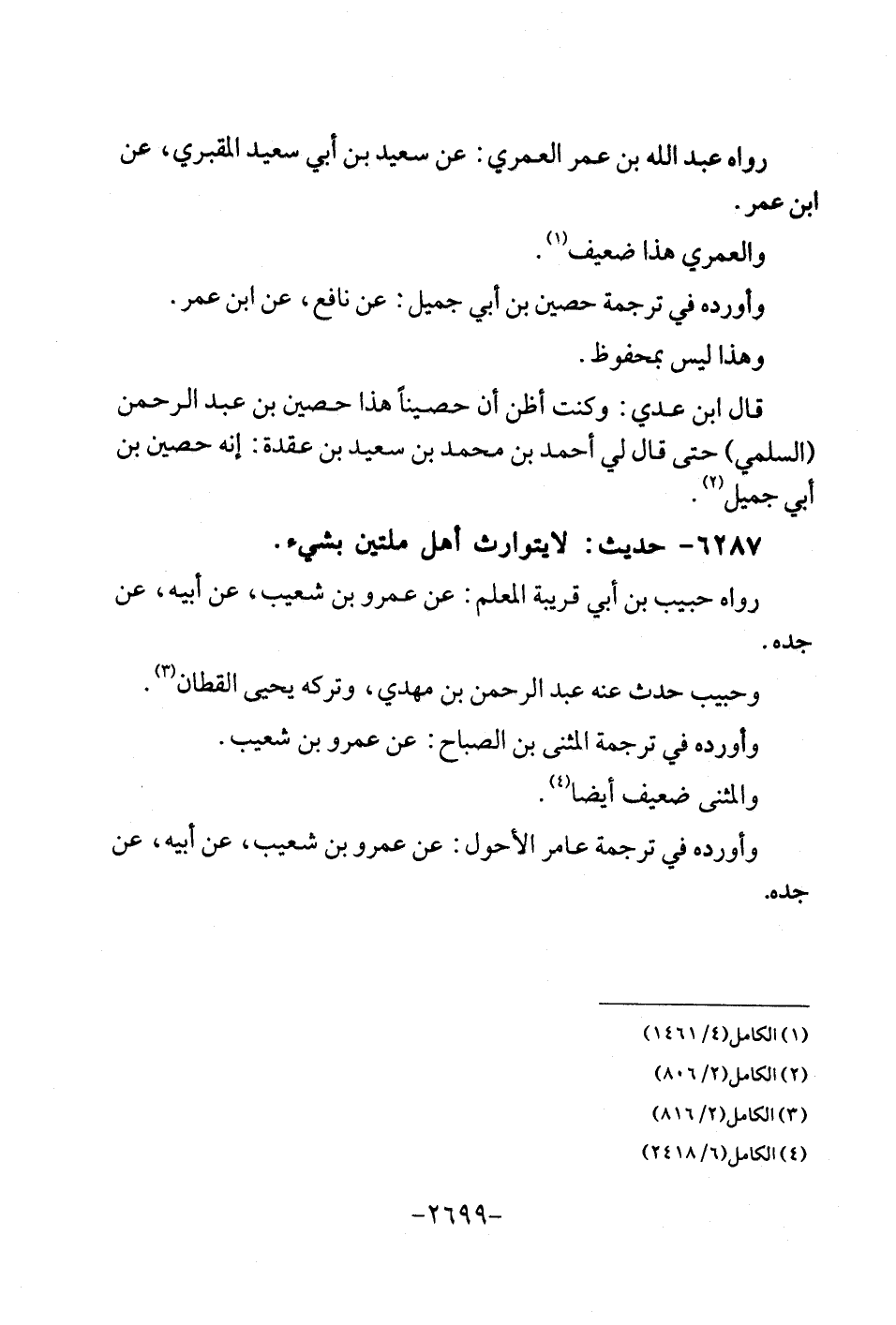 6287 - حَدِيث: لَا يتوارث أهل ملتين بِشَيْء. رَوَاهُ حبيب بن أبي قريبَة الْمعلم: عَن عَمْرو بن شُعَيْب، عَن أَبِيه، عَن جده. وحبِيب حدث عَنهُ عبد الرَّحْمَن بن مهْدي، وَتَركه يحيى الْقطَّان. وَأوردهُ فِي تَرْجَمَة الْمثنى بن الصَّباح: عَن عَمْرو بن شُعَيْب. والمثنى ضَعِيف أَيْضا. وَأوردهُ فِي تَرْجَمَة عَامر الْأَحول: عَن عَمْرو بن شُعَيْب، عَن أَبِيه، عَن جده