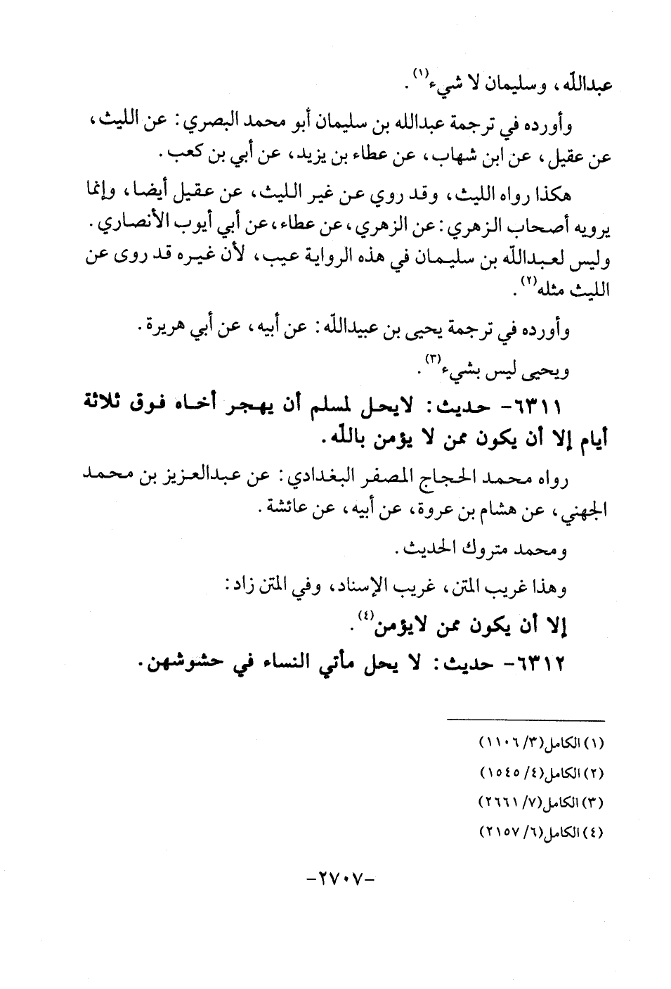 6311 - حَدِيث: لَا يحل لمُسلم أَن يهجر أَخَاهُ فَوق ثَلَاثَة أَيَّام إِلَّا أَن يكون مِمَّن لَا يُؤمن بِاللَّه. رَوَاهُ مُحَمَّد الْحجَّاج المصفر الْبَغْدَادِيّ: عَن عبد الْعَزِيز بن مُحَمَّد الْجُهَنِيّ، عَن هِشَام بن عُرْوَة، عَن أَبِيه، عَن عَائِشَة. وَمُحَمّد مَتْرُوك الحَدِيث. وَهَذَا غَرِيب الْمَتْن، غَرِيب الْإِسْنَاد، وَفِي الْمَتْن زَاد. إِلَّا أَن يكون مِمَّن لَا يُؤمن.