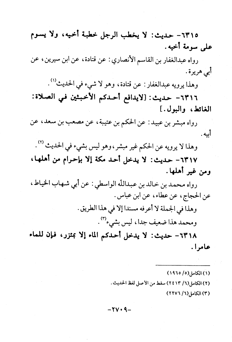 6315 - حَدِيث: لَا يخْطب الرجل خطْبَة أَخِيه، وَلَا يسوم على سومة أَخِيه. رَوَاهُ عبد الْغفار بن الْقَاسِم الْأنْصَارِيّ: عَن قَتَادَة، عَن أبن سِيرِين، عَن أبي هُرَيْرَة. وَهَذَا يرويهِ عبد الْغفار: عَن قَتَادَة، وَهُوَ لَا شيي فِي الحَدِيث.