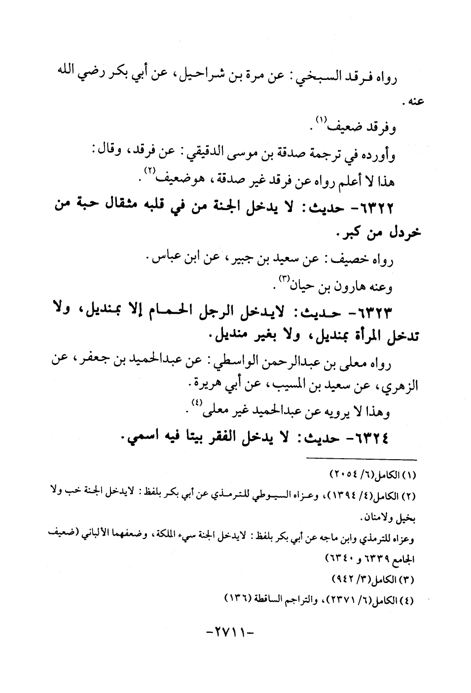 رَوَاهُ فرقد السبخي: عَن مرّة بن شرَاحِيل، عَن أبي بكر رَضِي الله عَنهُ. وفرقد ضَعِيف. وَأوردهُ فِي تَرْجَمَة صَدَقَة بن مُوسَى الدقيقي: عَن فرقد، وَقَالَ: هَذَا لَا أعلم رَوَاهُ عَن فرقد غير صَدَقَة، هُوَ ضَعِيف.