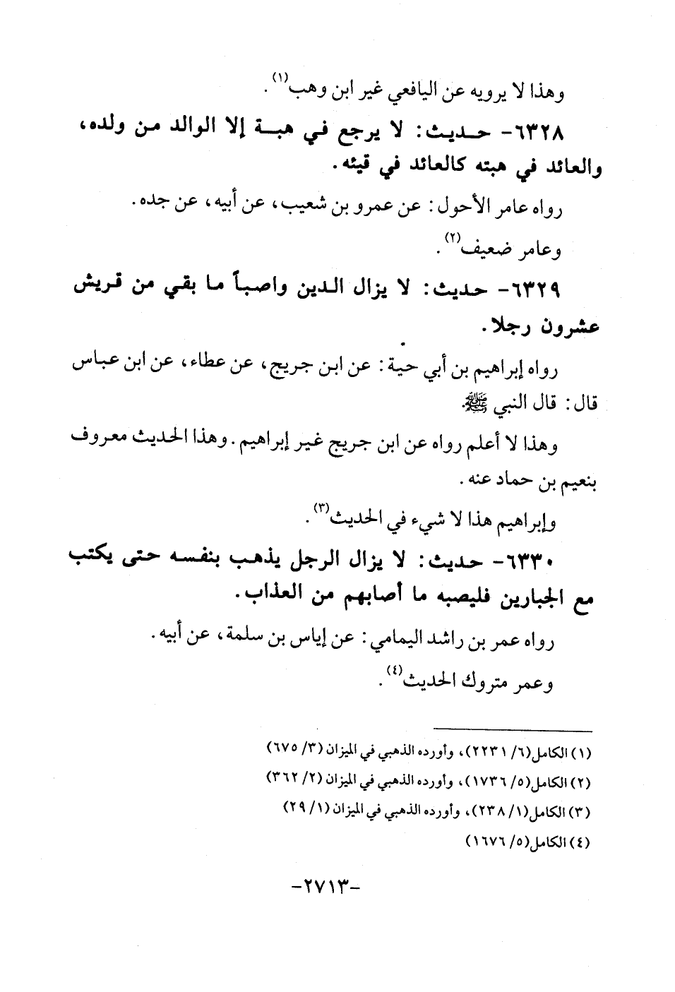 6330 - حَدِيث: لَا يزَال الرجل يذهب بِنَفسِهِ حَتَّى يكْتب مَعَ الجبارين فليصبه مَا أَصَابَهُم من الْعَذَاب. رَوَاهُ عمر بن رَاشد اليمامي: عَن إِيَاس بن سَلمَة، عَن أَبِيه. وَعمر مَتْرُوك الحَدِيث