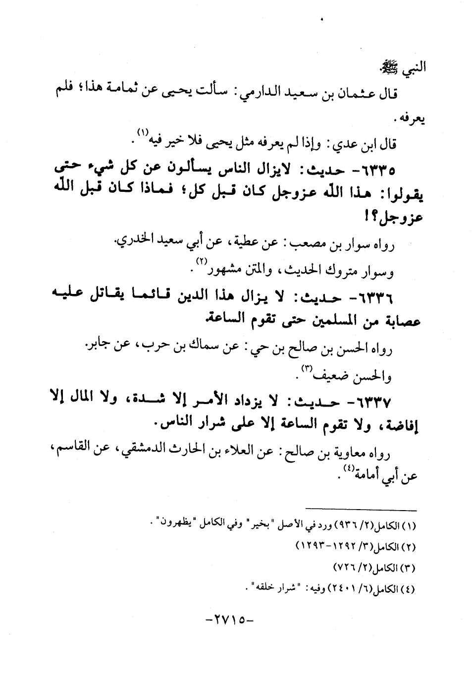 6335 - حَدِيث: لَا يزَال النَّاس يسْأَلُون عَن كل شَيْء حَتَّى يَقُولُوا: هَذَا الله عزوجل كَانَ قبل كل؛ فَمَاذَا كَانَ قبل الله عزوجل؟ ! رَوَاهُ سوار بن مُصعب: عَن عَطِيَّة، عَن أبي سعيد الْخُدْرِيّ. وسوار مَتْرُوك الحَدِيث، والمتن مَشْهُور.