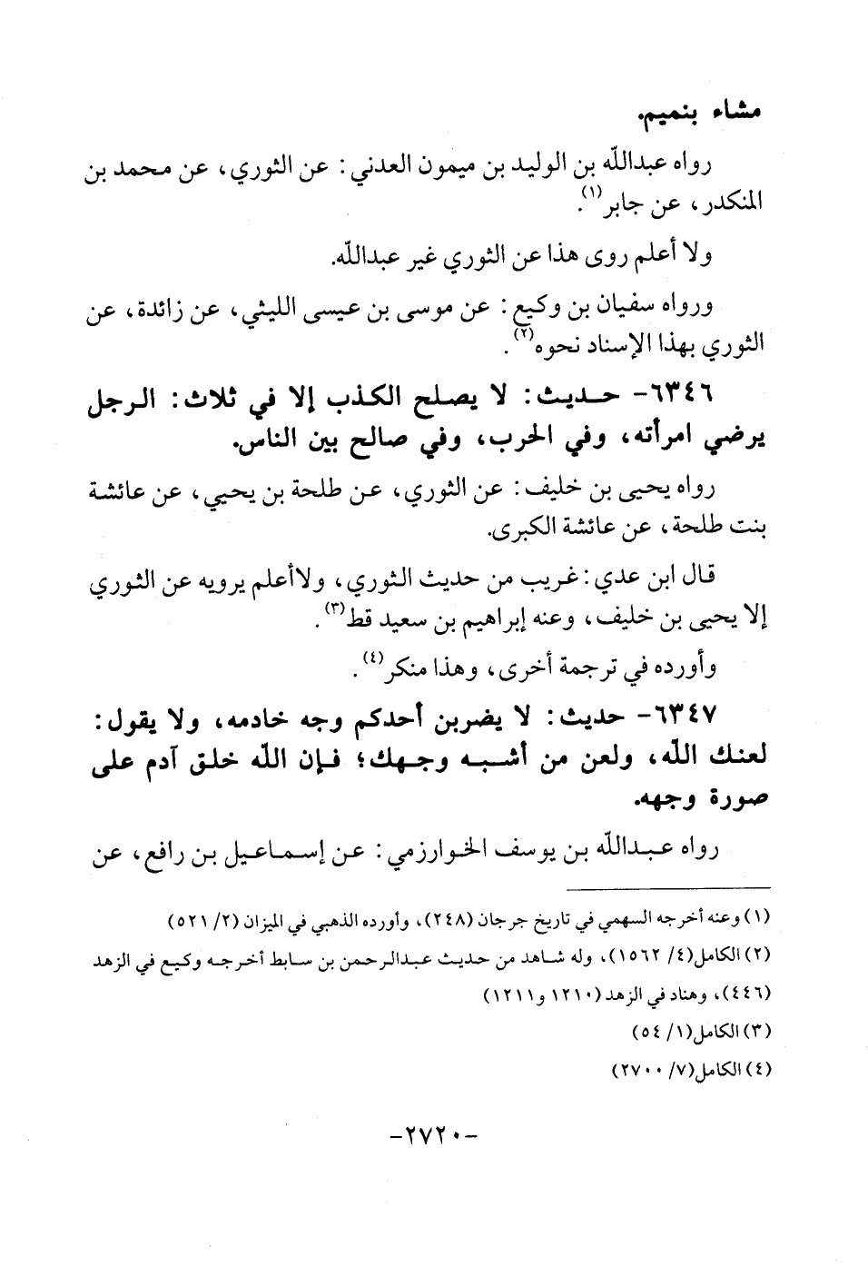 6346 - حَدِيث: لَا يصلح الْكَذِب إِلَّا فِي ثَلَاث: الرجل يرضى امْرَأَته، وَفِي الْحَرْب، وَفِي صَالح بَين النَّاس. رَوَاهُ يحيى بن خليف: عَن الثَّوْريّ، عَن طَلْحَة بن يحيى، عَن عَائِشَة بنت طَلْحَة، عَن عَائِشَة الْكُبْرَى. قَالَ ابْن عدي: غَرِيب من حَدِيث الثَّوْريّ، وَلَا أعلم يرويهِ عَن الثَّوْريّ إِلَّا يحيى بن خليف، وَعنهُ إِبْرَاهِيم بن سعيد قطّ. واورده فِي تَرْجَمَة أُخْرَى، وَهَذَا مُنكر.