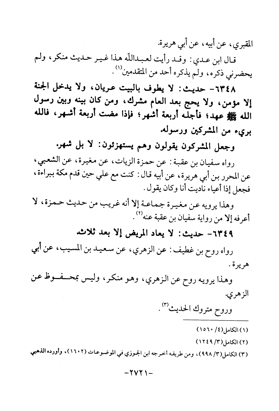 6348 - حَدِيث: لَا يطوف بِالْبَيْتِ عُرْيَان، وَلَا يدْخل الْجنَّة إِلَّا مُؤمن، وَلَا يحجّ بعد الْعَام مُشْرك، وَمن كَانَ بَينه وَبَين رَسُول الله - صلى الله عَلَيْهِ وَسلم - عهد، فَأَجله أَرْبَعَة أشهر؛ فَإِذا مَضَت اربعة اشهر، فَالله بَرِيء من الْمُشْركين وَرَسُوله. وَجعل الْمُشْركُونَ يَقُولُونَ وهم يستهزئون: لَا بل شهر. رَوَاهُ سُفْيَان بن عقبَة: عَن حَمْزَة الزيات، عَن مُغيرَة، عَن الشّعبِيّ، عَن الْمُحَرر بن أبي هُرَيْرَة، عَن أَبِيه قَالَ: كنت مَعَ عَليّ حِين قدم مَكَّة بِبَرَاءَة فَجعل إِذا أعياء ناديت أَنا وَكَانَ يَقُول. وَهَذَا يرويهِ عَن مغيره جمَاعَة إِلَّا أَنه غَرِيب من حَدِيث حَمْزَة، لَا اعرفه إِلَّا من رِوَايَة سُفْيَان بن عقبَة عَنهُ.