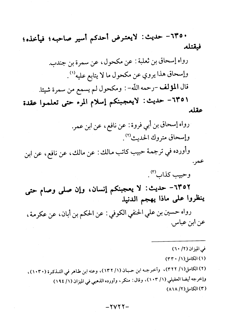 6351 - حَدِيث: لَا يعجبنكم إِسْلَام الْمَرْء حَتَّى تعلمُوا عقدَة عقلة. رَوَاهُ إِسْحَاق بن أبي فَرْوَة: عَن نَافِع، عَن ابْن عمر. وَإِسْحَاق مَتْرُوك الحَدِيث. وَأوردهُ فِي تَرْجَمَة حبيب كَاتب مَالك: عَن مَالك، عَن نَافِع، عَن ابْن عمر. وحبِيب كَذَّاب.