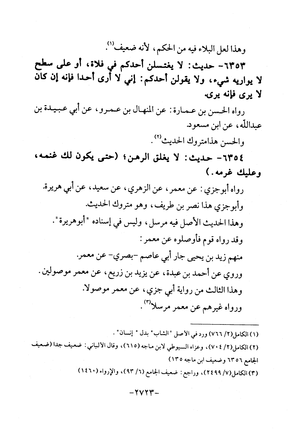 6353 - حَدِيث: لَا يغتسلن أحدكُم فِي فلاة، أَو على سطح لَا يواريه شَيْء، وَلَا يَقُولَن أحدكُم: إِنِّي لَا أرى أحدا فَإِنَّهُ إِن كَانَ لَا يرى فَإِنَّهُ يرى. رَوَاهُ الْحسن بن عمَارَة: عَن الْمنْهَال بن عَمْرو، عَن أبي عُبَيْدَة بن عبد الله، عَن ابْن مَسْعُود. وَالْحسن هَذَا مَتْرُوك الحَدِيث.