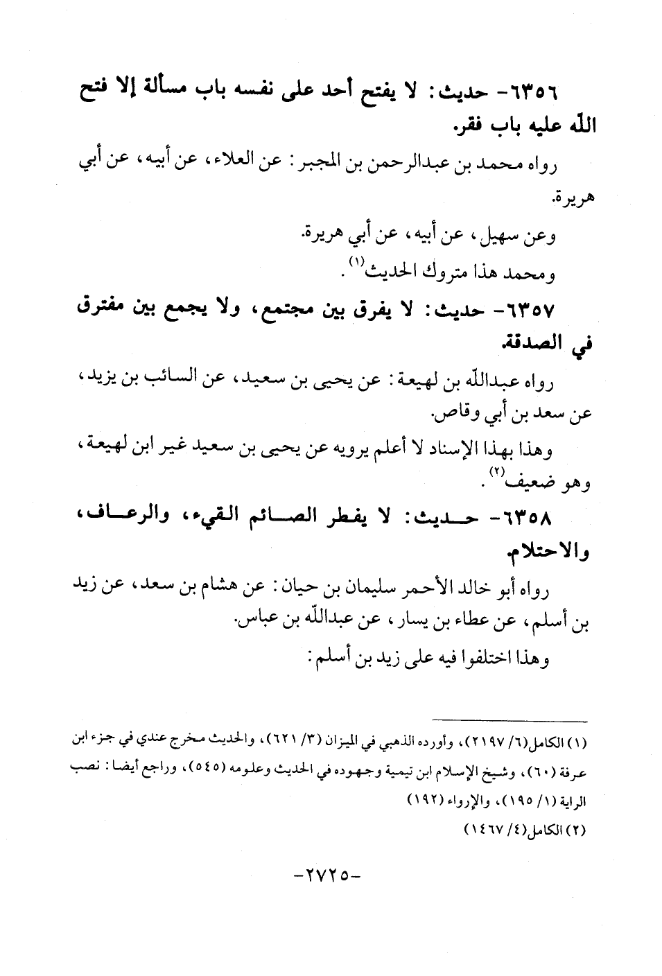 6356 - حَدِيث: لايفتح أحد على نَفسه بَاب مَسْأَلَة إِلَّا فتح الله عَلَيْهِ بَاب فقر. رَوَاهُ مُحَمَّد بن عبد الرَّحْمَن بن الْمُجبر: عَن الْعَلَاء، عَن أَبِيه، عَن أبي هُرَيْرَة. وَعَن سُهَيْل، عَن أَبِيه، عَن أبي هُرَيْرَة. وَمُحَمّد هَذَا مَتْرُوك الحَدِيث.
