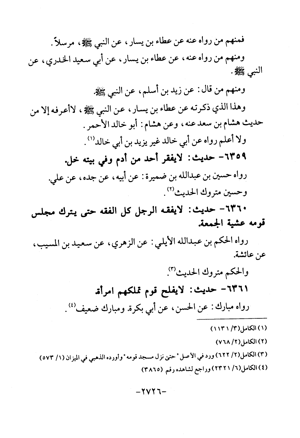 6360 - حَدِيث: لَا يفقه الرجل كل الْفِقْه حَتَّى يتْرك مجْلِس قومه عَشِيَّة الْجُمُعَة. رَوَاهُ الحكم بن عبد الله الْأَيْلِي: عَن الزُّهْرِيّ، عَن سعيد بن الْمسيب، عَن عَائِشَة. وَالْحكم مَتْرُوك الحَدِيث.