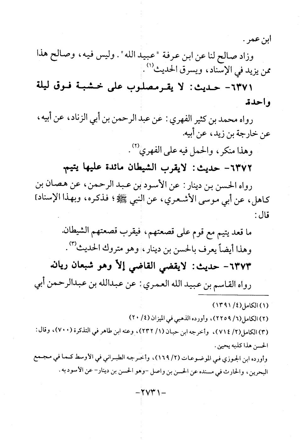 6372 - حَدِيث: لَا يقرب الشَّيْطَان مائدة عَلَيْهَا يَتِيم. رَوَاهُ الْحسن بن دِينَار: عَن الْأسود بن عبد الرَّحْمَن، عَن هصان بن كَاهِل، عَن أبي مُوسَى الْأَشْعَرِيّ، عَن النَّبِي - صلى الله عَلَيْهِ وَسلم - فَذكره، وَبِهَذَا الاسناد قَالَ: مَا قعد يَتِيم مَعَ قوم على قصعتهم، فَيقرب قصعتهم الشَّيْطَان. وَهَذَا أَيْضا يعرف بالْحسنِ بن دِينَار، وَهُوَ مَتْرُوك الحَدِيث.