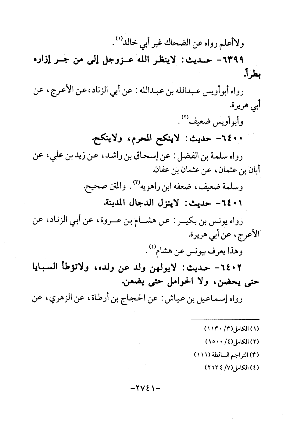 6399 - حَدِيث: لاينظر الله عزوجل إِلَى من جر إزَاره بطراً. رَوَاهُ أَبُو أويس عبد الله بن عبد الله: عَن أبي الزِّنَاد، عَن الْأَعْرَج، عَن أَبى هُرَيْرَة. وَأَبُو أويس ضَعِيف.