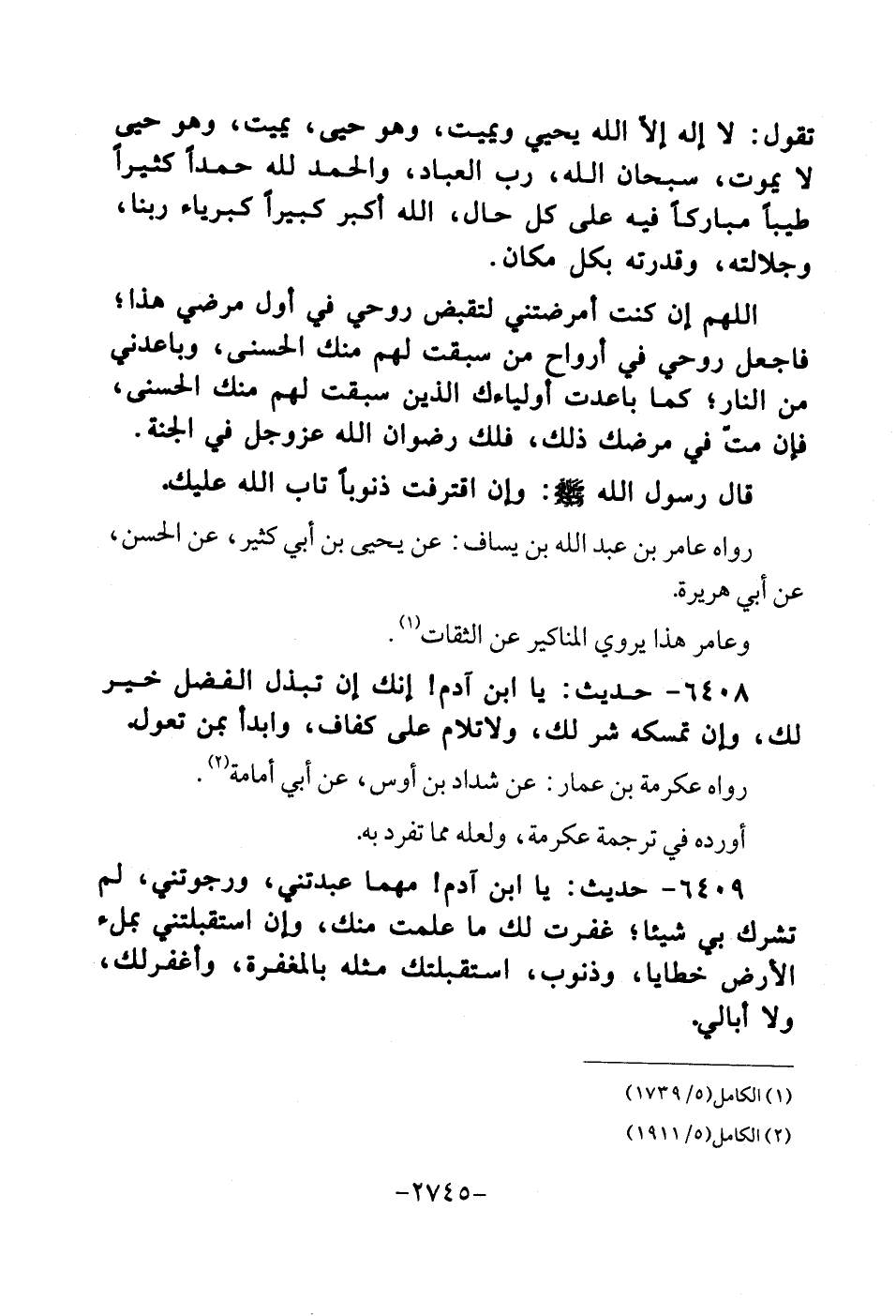 تَقول: لَا اله إِلَّا الله يحيي وَيُمِيت، وَهُوَ حيى، يُمِيت، وَهُوَ حيى لَا يَمُوت، سُبْحَانَ الله، رب الْعباد، وَالْحَمْد لله حمدا كثيرا طيبا مُبَارَكًا فِيهِ على كل حَال، الله أكبر كَبِيرا كبرياء رَبنَا، وجلالته، وَقدرته بِكُل مَكَان. اللَّهُمَّ إِن كنت أمرضتني لتقبض روحي فِي أول مرضِي هَذَا؛ فَاجْعَلْ روحي فِي أَرْوَاح من سبقت لَهُم مِنْك الْحسنى، وباعدني من النَّار؛ كَمَا باعدت أولياءك الَّذين سبقت لَهُم مِنْك الْحسنى، فَإِن مت فِي مرضك ذَلِك، فلك رضوَان الله عزوجل فِي الْجنَّة. قَالَ رَسُول الله - صلى الله عَلَيْهِ وَسلم - كل: وان اقترفت ذنوبا تَابَ الله عَلَيْك. رَوَاهُ عَامر بن عبد الله بن يسَاف: عَن يحيى بن أبي كثير، عَن الْحسن، عَن أبي هُرَيْرَة. وعامر هَذَا يروي الْمَنَاكِير عَن الثِّقَات.