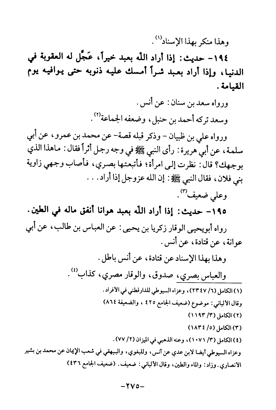 194 - حَدِيث: إِذا أَرَادَ الله بِعَبْد خيرأ، عَجَّل لَهُ الْعقُوبَة فِي الدُّنْيَا، وَإِذا أَرَادَ بِعَبْد شرا أمسك عَلَيْهِ ذنُوبه حَتَّى يوافيه يَوْم الْقِيَامَة وَرَوَاهُ سعد بن سِنَان. عَن أنس. وَسعد تَركه أَحْمد بن حَنْبَل، وَضَعفه الْجَمَاعَة. وَرَوَاهُ عَليّ بن ظبْيَان - وَذكر قبله قصَّة - عَن مُحَمَّد بن عَمْرو، عَن أبي سَلمَة، عَن أبي هُرَيْرَة: رأى النَّبِي فِي وَجه رجل أثرا فَقَالَ. مَا هَذَا الَّذِي بِوَجْهِك؟ قَالَ: نظرت إِلَى امْرَأَة، فأتبعتها بَصرِي، فَأصَاب وَجْهي زَاوِيَة بني فلَان، فَقَالَ النَّبِي: إِن الله عز وَجل إِذا أَرَادَ ... وَعلي ضَعِيف.