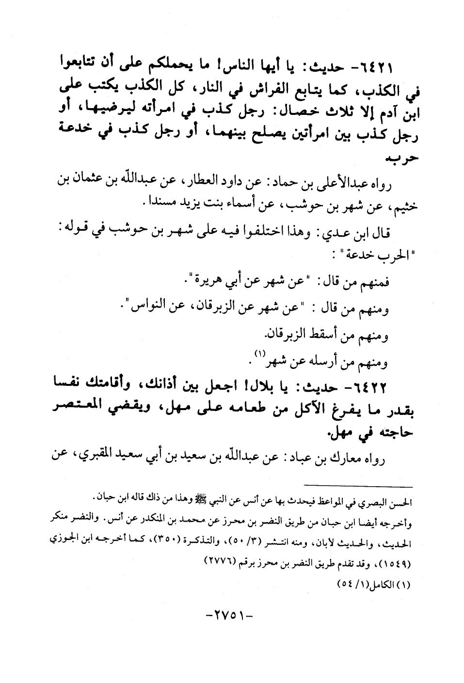 6421 - حَدِيث: يَا أَيهَا النَّاس {مَا يحملكم على أَن تتابعوا فِي الْكَذِب، كَمَا يُتَابع الْفراش فِي النَّار، كل الْكَذِب يكْتب على ابْن أَدَم إِلَّا ثَلَاث خِصَال: رجل كذب فِي امْرَأَته ليرضيها، أَو رجل كذب بَين امْرَأتَيْنِ يصلح بَينهمَا، أَو رجل كذب فِي خدعة حَرْب. رَوَاهُ عبد الْأَعْلَى بن حَمَّاد: عَن دَاوُد الْعَطَّار، عَن عبد الله بن عُثْمَان بن خثيم، عَن شهر بن حَوْشَب، عَن أَسمَاء بنت يزِيد مُسْندًا. قَالَ ابْن عدي: وَهَذَا اخْتلفُوا فِيهِ على شهر بن حَوْشَب فِي قَوْله: " الْحَرْب خدعة ": فَمنهمْ من قَالَ: " عَن شهر عَن أبي هُرَيْرَة ". وَمِنْهُم من قَالَ: " عَن شهر عَن الزبْرِقَان، عَن النواس ". وَمِنْهُم من أسقط الزبْرِقَان. وَمِنْهُم من أرْسلهُ عَن شهر.