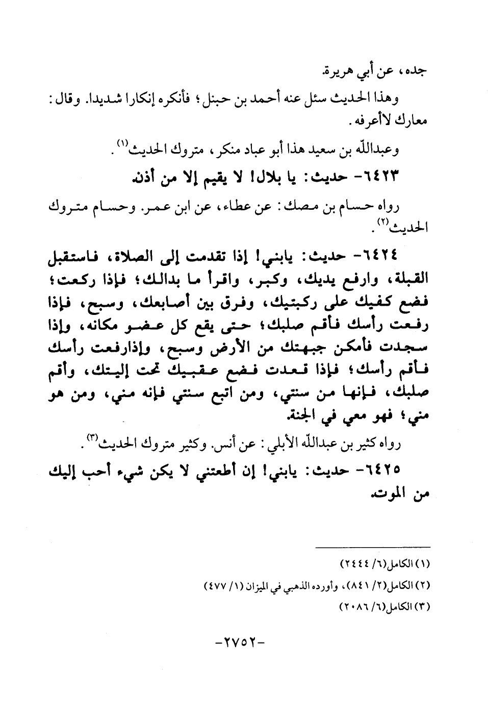 6424 - حَدِيث: يابني} إِذا تقدّمت إِلَى الصَّلَاة، فَاسْتقْبل الْقبْلَة، وارفع يَديك، وَكبر، واقرأ مَا بدالك {فَإِذا ركعت، فضع كفيك على ركبتيك، وَفرق بَين أصابعك، وَسبح، فَإِذا رفعت رَأسك فاقم صلبك؛ حَتَّى يَقع كل عُضْو مَكَانَهُ، واذا سجدت فامكن جبهتك من الأَرْض وَسبح، واذا رفعت رَأسك فاقم رَأسك؛ فَإِذا قعدت فضع عقبيك تَحت إليتك، وأقم صلبك، فَإِنَّهَا من سنتي، وَمن اتبع سنتي فانه مني، وَمن هُوَ مني؛ فَهُوَ معي فِي الْجنَّة. - رَوَاهُ كثير بن عبد الله الأبلي: عَن أنس. وَكثير مَتْرُوك الحَدِيث.