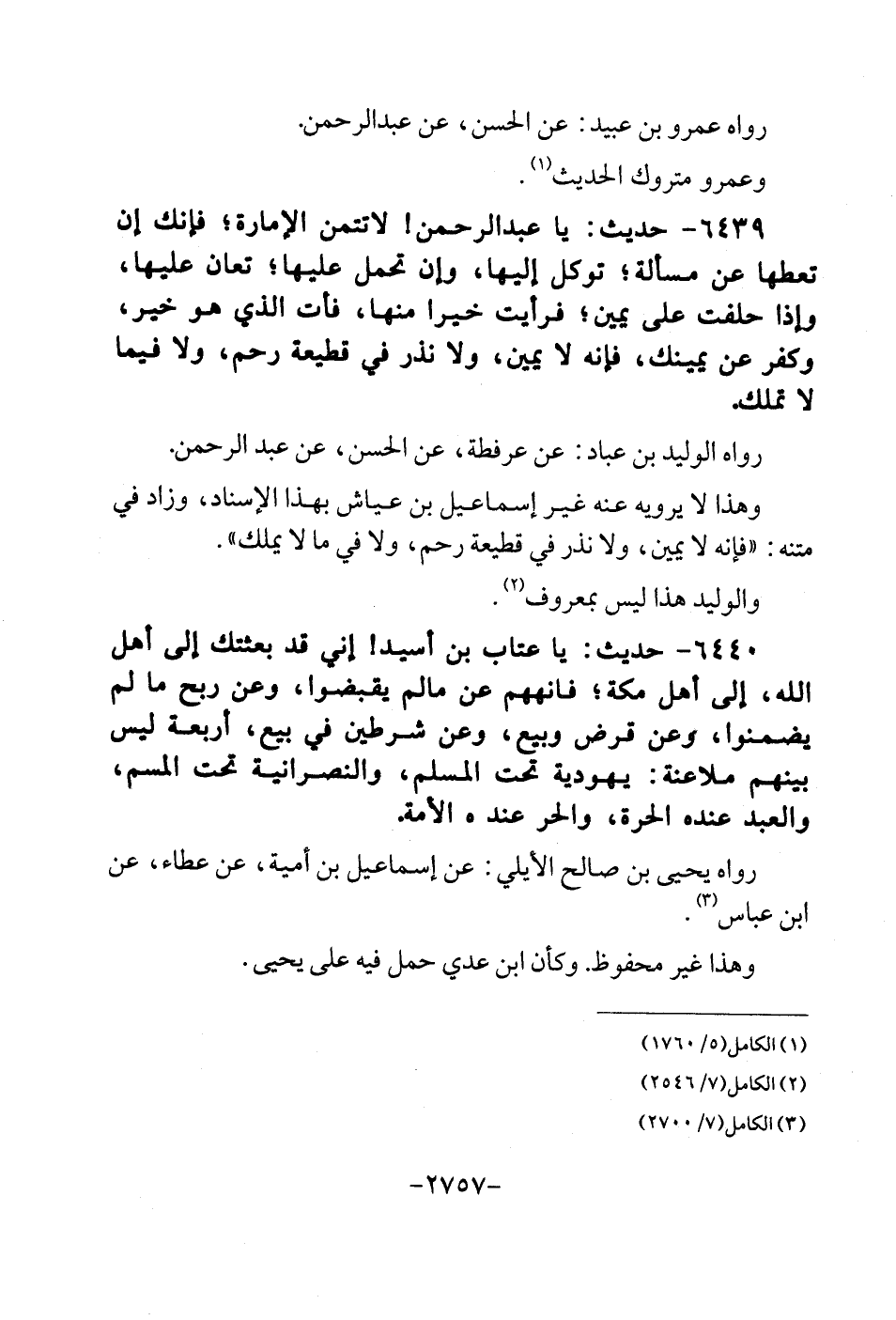 6439 - حَدِيث: يَا عبد الرحمن {لاتتمن الامارة؛ فانك ان تعطها عَن مسالة؛ توكل اليها، وَإِن تحمل عَلَيْهَا؛ تعان عَلَيْهَا، وَإِذا حَلَفت على يَمِين؛ فَرَأَيْت خيرا مِنْهَا، فَاتَ الَّذِي هُوَ خير، وَكفر عَن يَمِينك، فانه لَا يَمِين، وَلَا نذر فِي قطيعة رحم، وَلَا فِيمَا لَا تملك رَوَاهُ الْوَلِيد بن عباد: عَن عرفطة، عَن الْحسن، عَن عبد الرَّحْمَن. وَهَذَا لَا يرويهِ عَنهُ غير إِسْمَاعِيل بن عَيَّاش بِهَذَا الْإِسْنَاد، وَزَاد فِي مَتنه. " فَإِنَّهُ لَا يَمِين، وَلَا نذر فِي قطيعة رحم، وَلَا فِي مَا لَا يملك ". والوليد هَذَا لَيْسَ بِمَعْرُوف.
