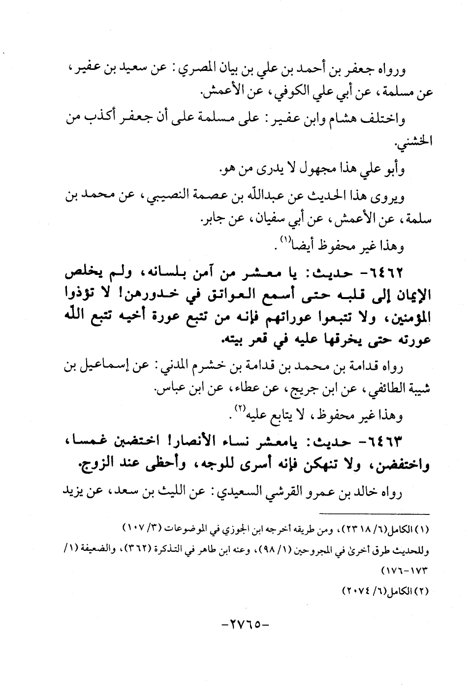 6462 - حَدِيث: يَا معشر من آمن بِلِسَانِهِ، وَلم يخلص الْإِيمَان إِلَى قلبه حَتَّى أسمع الْعَوَاتِق فِي خُدُورهنَّ {لَا تُؤْذُوا الْمُؤمنِينَ، وَلَا حَتَّى تتبعوا عَوْرَاتهمْ فَإِنَّهُ من تتبع عَورَة أَخِيه تتبع الله عَوْرَته حَتَّى يخرقها عَلَيْهِ فِي عقر بَيته. رَوَاهُ قدامَة بن مُحَمَّد بن قدامَة بن خشرم الْمدنِي: عَن إِسْمَاعِيل بن شيبَة الطَّائِفِي، عَن إِبْنِ جريج، عَن عَطاء، عَن ابْن عَبَّاس. وَهَذَا غير مَحْفُوظ، لَا يُتَابع عَلَيْهِ.