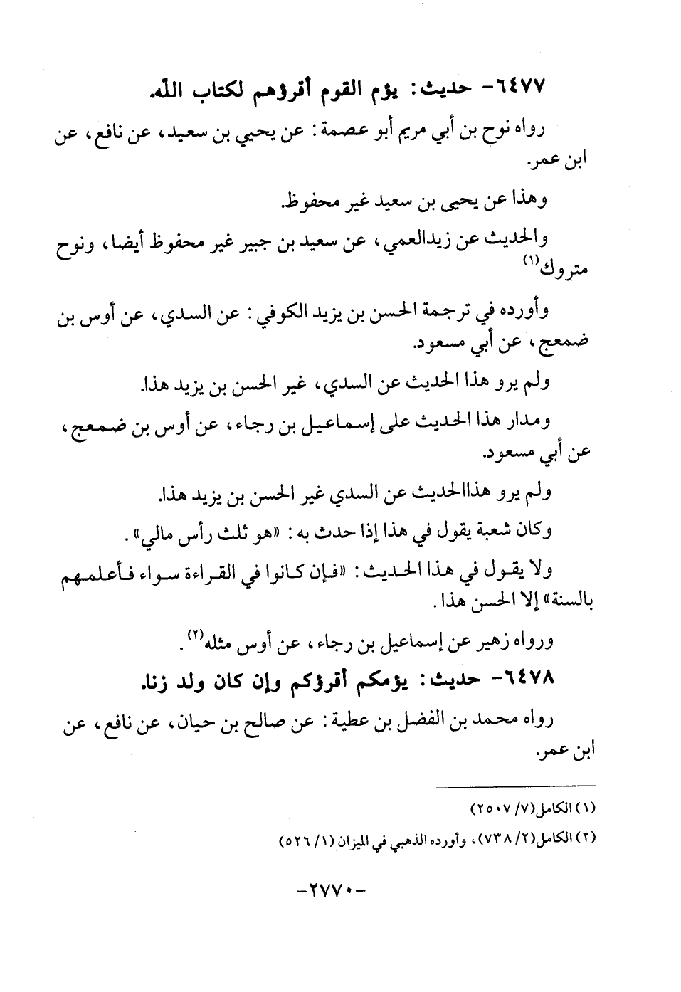 6477 - حَدِيث: يؤم الْقَوْم أقرؤهم لكتاب الله. رَوَاهُ نوح بن أبي مَرْيَم أَبُو عصمَة: عَن يحيى بن سعيد، عَن نَافِع، عَن ابْن عمر. وَهَذَا عَن يحيى بن سعيد غير مَحْفُوظ. والْحَدِيث عَن زيد الْعمي، عَن سعيد بن جُبَير غير مَحْفُوظ أَيْضا، ونوح مَتْرُوك. وَأوردهُ فِي تَرْجَمَة الْحسن بن يزِيد الْكُوفِي: عَن السّديّ، عَن أَوْس بن ضمعج، عَن أبي مَسْعُود. وَلم يرو هَذَا الحَدِيث عَن السّديّ، غير الْحسن بن يزِيد هَذَا. ومدار هَذَا الحَدِيث على إِسْمَاعِيل بن رَجَاء، عَن أَوْس بن ضمعج عَن أبي مَسْعُود. وَلم يرو هَذَا الحَدِيث عَن السّديّ غير الْحسن بن يزِيد هَذَا. وَكَانَ شُعْبَة يَقُول فِي هَذَا إِذا حدث بِهِ: ((هُوَ ثلث رَأس مَالِي)) . وَلَا يَقُول فِي هَذَا الحَدِيث: ((فَإِن كَانُوا فِي الْقِرَاءَة سَوَاء فأعلمهم بِالسنةِ)) إِلَّا الْحسن هَذَا. وَرَوَاهُ زُهَيْر عَن إِسْمَاعِيل بن رَجَاء، عَن أَوْس مثله.
