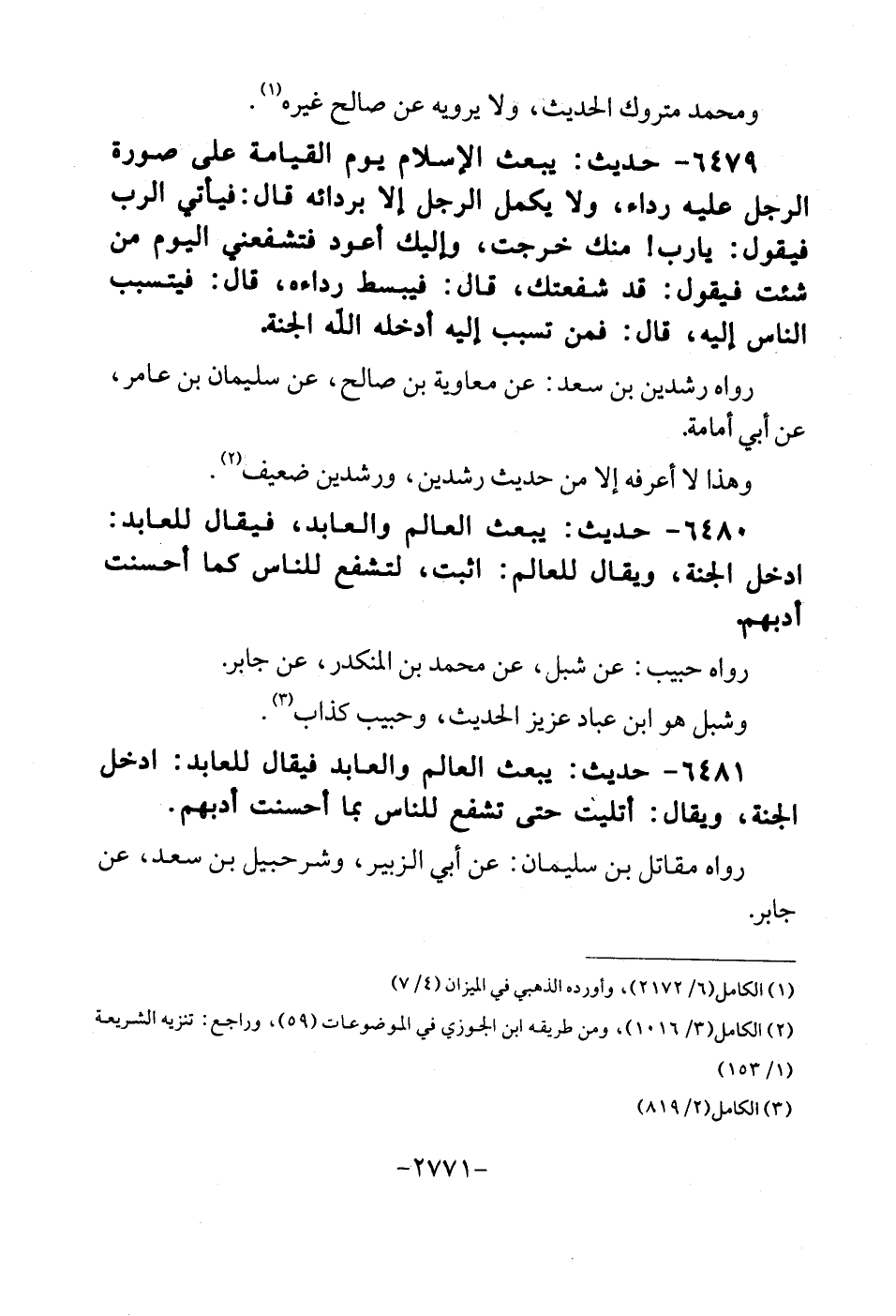 6480 - حَدِيث: يبْعَث الْعَالم وَالْعَابِد، فَيُقَال للعابد: ادخل الْجنَّة وَيُقَال للْعَالم: اثْبتْ، لتشفع للنَّاس كَمَا أَحْسَنت أدبهم. رَوَاهُ حبيب: عَن شبْل، عَن مُحَمَّد بن الْمُنْكَدر، عَن جَابر. وشبل هُوَ ابْن عباد عَزِيز الحَدِيث، وحبِيب كَذَّاب.