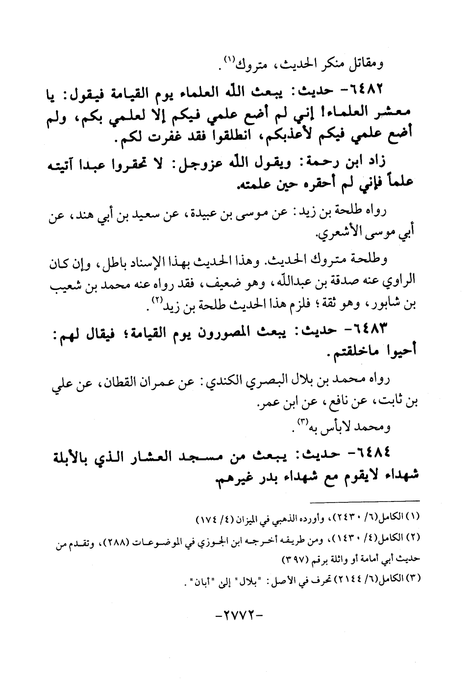 6482 - حَدِيث: يبْعَث الله الْعلمَاء يَوْم الْقِيَامَة فَيَقُول: يَا معشر الْعلمَاء! إِنِّي لم أَضَع علمي فِيكُم إِلَّا لعلمي بكم، وَلم أَضَع علمي فِيكُم لأعذبكم، انْطَلقُوا فقد غفرت لكم. زَاد ابْن رَحْمَة: وَيَقُول الله عز وَجل: لَا تحقروا عبدا آتيته علما فَإِنِّي لم أحقره حِين عَلمته. رَوَاهُ طَلْحَة بن زيد: عَن مُوسَى بن عُبَيْدَة، عَن سعيد بن أبي هِنْد، عَن أبي مُوسَى الْأَشْعَرِيّ. وَطَلْحَة مَتْرُوك الحَدِيث. وَهَذَا الحَدِيث بِهَذَا الْإِسْنَاد بَاطِل، وَإِن كَانَ الرَّاوِي عَنهُ صَدَقَة بن عبد الله، وَهُوَ ضَعِيف، فقد رَوَاهُ عَنهُ مُحَمَّد بن شُعَيْب بن شَابُور، وَهُوَ ثِقَة؛ فَلَزِمَ هَذَا الحَدِيث طَلْحَة بن زيد.
