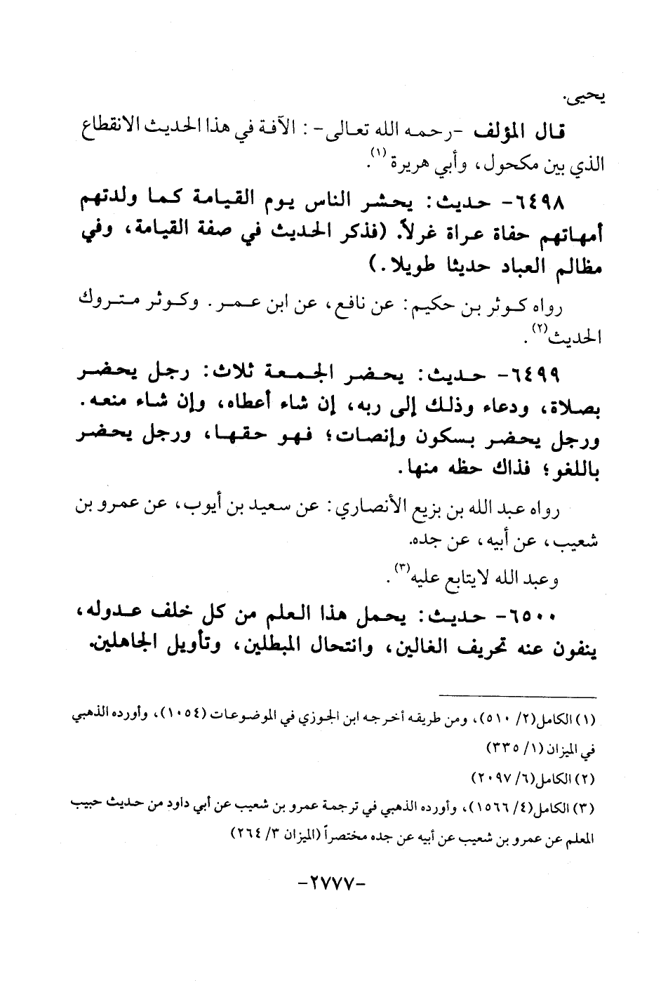 6498 - حَدِيث: يحْشر النَّاس يَوْم الْقِيَامَة كَمَا ولدتهم: أمهاتهم حُفَاة عُرَاة غرلًا. (فَذكر الحَدِيث فِي صفة الْقِيَامَة، وَفِي مظالم الْعباد حَدِيثا طَويلا.) رَوَاهُ كوثر بن حَكِيم: عَن نَافِع، عَن ابْن عمر. وكوثر مَتْرُوك الحَدِيث.