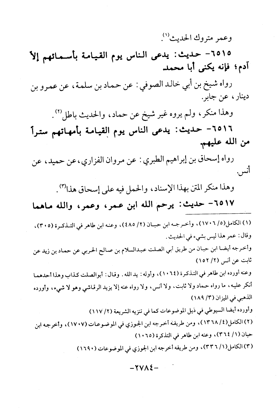6515 - حَدِيث: يدعى النَّاس يَوْم الْقِيَامَة بِأَسْمَائِهِمْ إِلَّا آدم؛ فَإِنَّهُ يكنى أَبَا مُحَمَّد. رَوَاهُ شيخ بن أبي خَالِد الصُّوفِي: عَن حَمَّاد بن سَلمَة، عَن عَمْرو بن دِينَار، عَن جَابر. وَهَذَا مُنكر، وَلم يروه غير شيخ عَن حَمَّاد، والْحَدِيث بَاطِل.