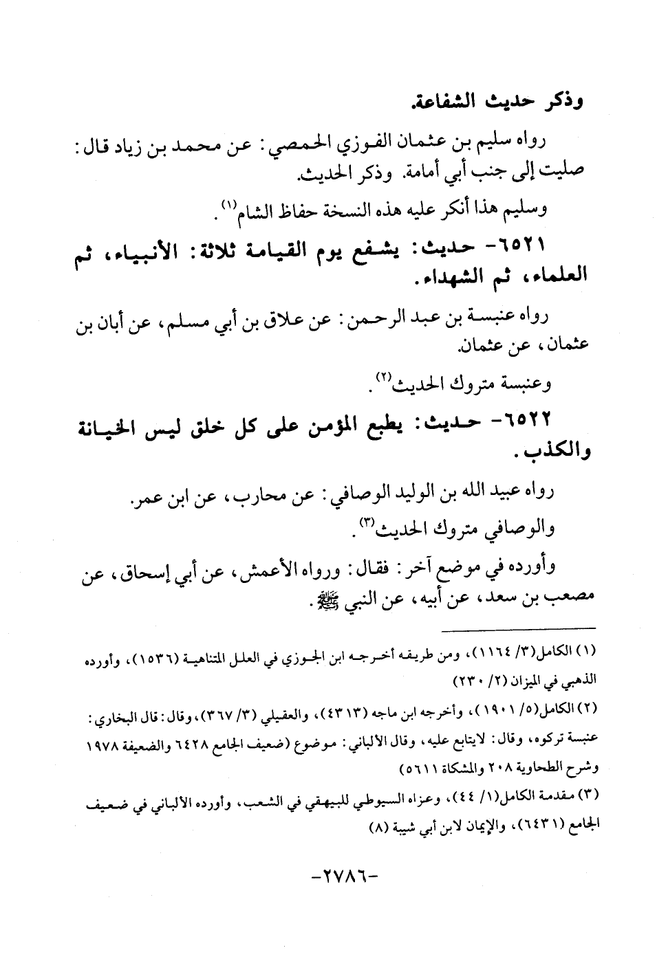6521 - حَدِيث: يشفع يَوْم الْقِيَامَة ثَلَاثَة: الْأَنْبِيَاء، ثمَّ الْعلمَاء، ثمَّ الشُّهَدَاء. رَوَاهُ عَنْبَسَة بن عبد الرَّحْمَن: عَن علاق بن أبي مُسلم، عَن أبان بن عُثْمَان، عَن عُثْمَان. وعنبسة مَتْرُوك الحَدِيث.