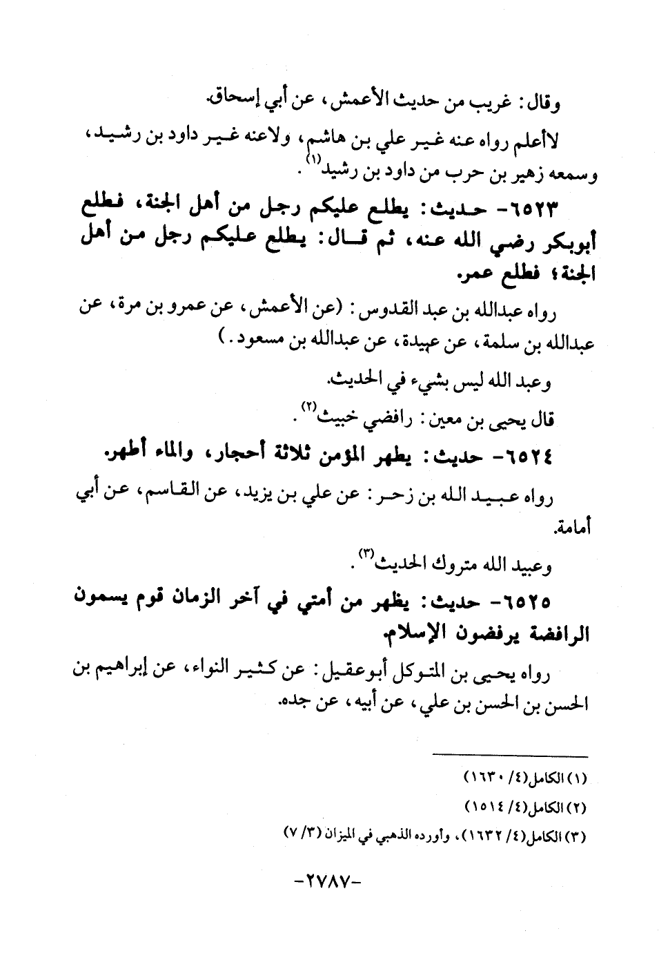 6523 - حَدِيث: يطلع عَلَيْكُم رجل من أهل الْجنَّة، فطلع أَبُو بكر رَضِي الله عَنهُ، ثمَّ قَالَ: يطلع عَلَيْكُم رجل من أهل الْجنَّة؛ فطلع عمر. رَوَاهُ عبد الرَّحْمَن بن عبد القدوس: (عَن الْأَعْمَش، عَن عَمْرو بن مرّة، عَن عبد الله بن سَلمَة، عَن عُبَيْدَة، عَن عبد الله بن مَسْعُود) . وَعبد الله لَيْسَ بِشَيْء فِي الحَدِيث. قَالَ يحيى بن معِين: رَافِضِي خَبِيث.