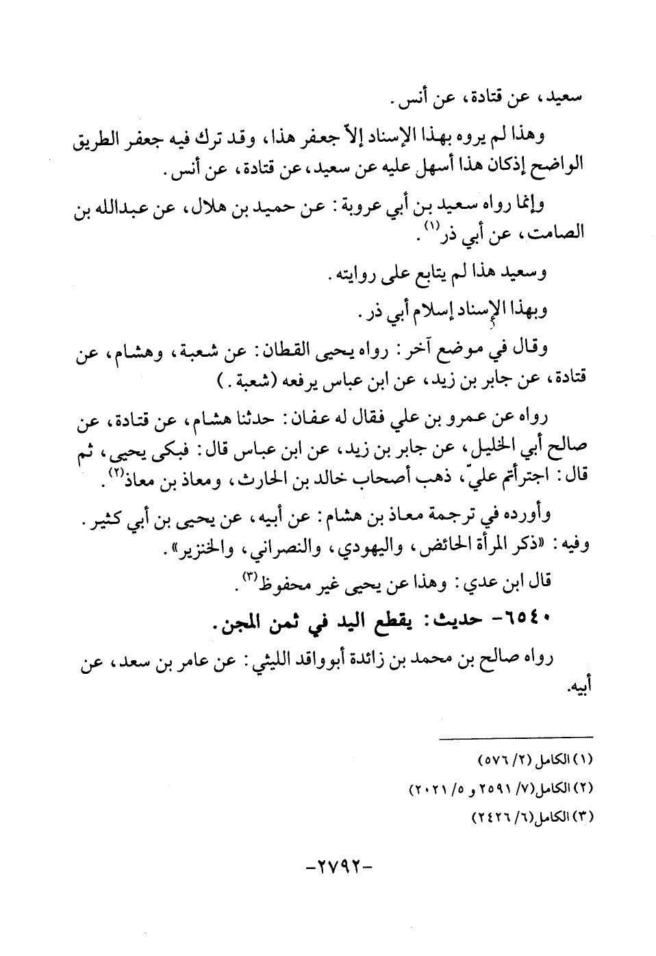 سعيد، عَن قَتَادَة، عَن أنس. وَهَذَا لم يروه بِهَذَا الْإِسْنَاد إِلَّا جَعْفَر هَذَا، وَقد ترك فِيهِ جَعْفَر الطَّرِيق الْوَاضِح إِذْ كَانَ هَذَا أسهل عَلَيْهِ عَن سعيد، عَن قَتَادَة، عَن أنس. وَإِنَّمَا رَوَاهُ سعيد بن أبي عُرْوَة: عَن حميد بن هِلَال، عَن عبد الله بن الصَّامِت، عَن أبي ذَر. وَسَعِيد هَذَا لم يُتَابع على رِوَايَته. وَبِهَذَا الاسناد إِسْلَام أبي ذَر. وَقَالَ فِي مَوضِع آخر: رَوَاهُ يحيى الْقطَّان: عَن شُعْبَة، وَهِشَام، عَن قَتَادَة، عَن جَابر بن زيد، عَن ابْن عَبَّاس يرفعهُ (شُعْبَة) . رَوَاهُ عَن عَمْرو بن عَليّ فَقَالَ لَهُ عَفَّان: حَدثنَا هِشَام، عَن قَتَادَة، عَن صَالح أبي الْخَلِيل، عَن جَابر بن زيد، عَن ابْن عَبَّاس قَالَ: فَبكى يحيى، ثمَّ قَالَ: أجترأتم عليّ، ذهب أَصْحَاب خَالِد بن الْحَارِث، ومعاذ بن معَاذ. وَأوردهُ فِي تَرْجَمَة معَاذ بن هِشَام: عَن أَبِيه، عَن يحيى بن أبي كثير. وَفِيه: " ذكر الْمَرْأَة الْحَائِض، واليهودي، وَالنَّصْرَانِيّ، وَالْخِنْزِير ". قَالَ ابْن عدي: وَهَذَا عَن يحيى غير مَحْفُوظ.
