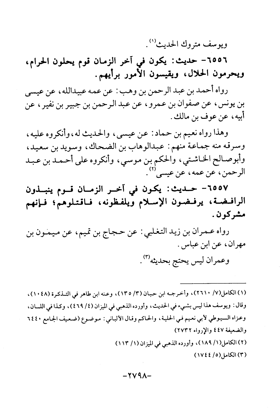 6556 - حَدِيث: يكون فِي آخر الزَّمَان قوم يحلونَ الْحَرَام، ويحرمون الْحَلَال، ويقيسون الْأُمُور برأيهم. رَوَاهُ أَحْمد بن عبد الرَّحْمَن بن وهب: عَن عَمه عبيد الله، عَن عِيسَى بن يُونُس، عَن صَفْوَان بن عَمْرو، عَن عبد الرَّحْمَن بن جُبَير بن نفير، عَن أَبِيه، عَن عَوْف بن مَالك. وَهَذَا رَوَاهُ نعيم بن حَمَّاد: عَن عِيسَى، والْحَدِيث لَهُ، وأنكروه عَلَيْهِ، وسرقة مِنْهُ جمَاعَة مِنْهُم: عبد الْوَهَّاب بن الضَّحَّاك، وسُويد بن سعيد، وَأَبُو صَالح الخاشتي، وَالْحكم بن مُوسَى، وأنكروه على أَحْمد بن عبد الرَّحْمَن، عَن عَمه، عَن عِيسَى.