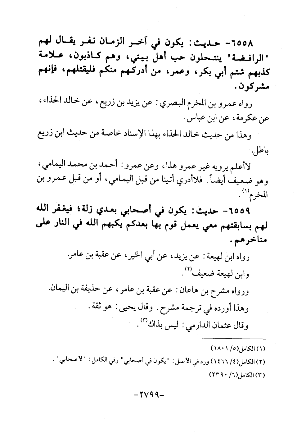 6558 - حَدِيث: يكون فِي آخر الزَّمَان نفر يُقَال لَهُم " الرافضة " ينتحلون حب أهل بَيْتِي، وهم كاذبون، عَلامَة كذبهمْ شتم أبي بكر، وَعمر، من أدركهم مِنْكُم فليقتلهم، فَإِنَّهُم مشركون. رَوَاهُ عمر بن المخرم الْبَصْرِيّ: عَن يزِيد بن زُرَيْع، عَن خَالِد الْحذاء، عَن عِكْرِمَة، عَن ابْن عَبَّاس. وَهَذَا من حَدِيث خَالِد الْحذاء بِهَذَا الاسناد خَاصَّة من حَدِيث ابْن زُرَيْع بَاطِل. لَا أعلم يرويهِ غير عَمْرو هَذَا، وَعَن عَمْرو: أَحْمد بن مُحَمَّد اليمامي، وَهُوَ ضَعِيف أَيْضا. فَلَا أَدْرِي أَتَيْنَا من قبل اليمامي، أَو من قبل عَمْرو بن المخرم.