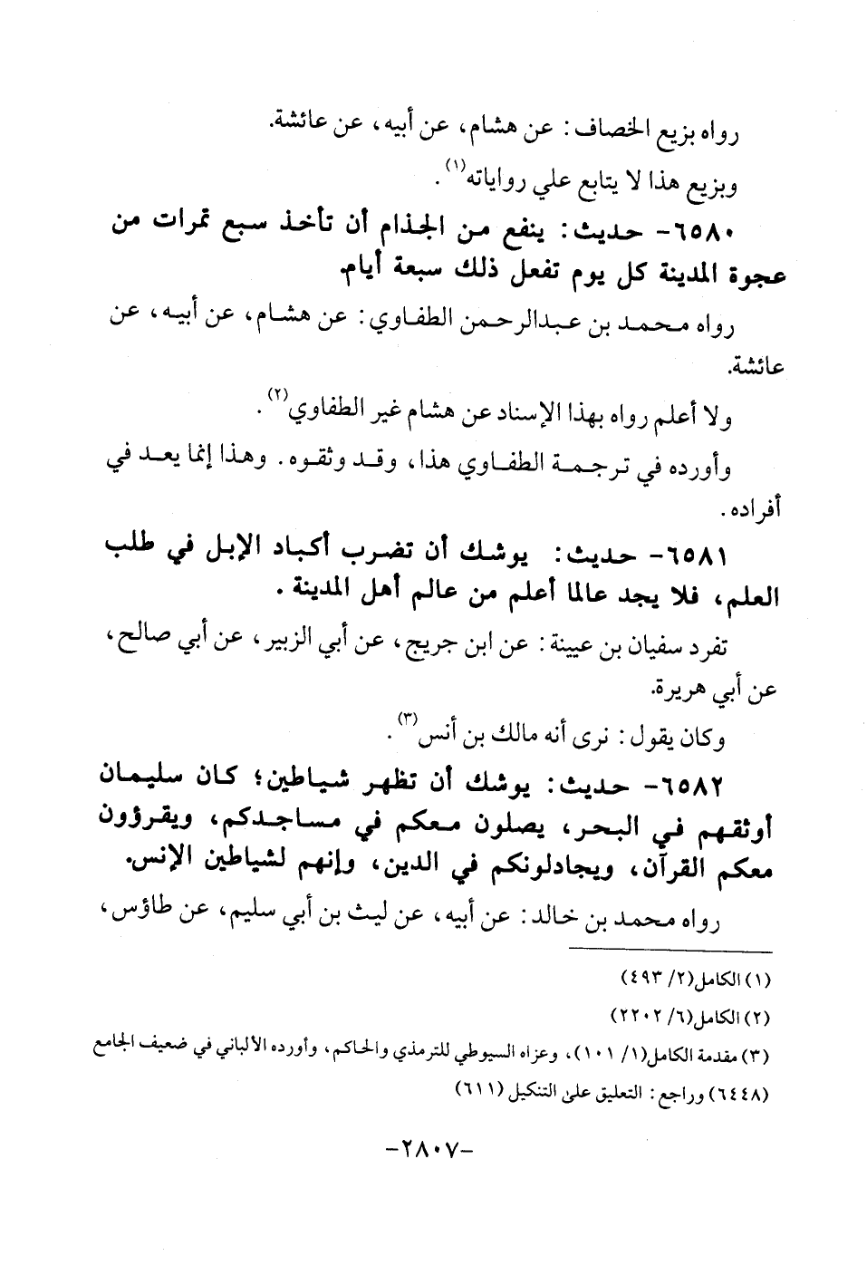 6580 - حَدِيث: ينفع من الجذام أَن تَأْخُذ سبع تمرات من عَجْوَة الْمَدِينَة كل يَوْم تفعل ذَلِك سَبْعَة أَيَّام. رَوَاهُ مُحَمَّد بن عبد الرَّحْمَن الطفَاوِي: عَن هِشَام، عَن أَبِيه، عَن عَائِشَة. وَلَا أعلم رَوَاهُ بِهَذَا الاسناد عَن هِشَام غير الطفَاوِي. وَأوردهُ فِي تَرْجَمَة الطفَاوِي هَذَا، وَقد وثقوه. وَهَذَا إِنَّمَا يعد فِي افراده.
