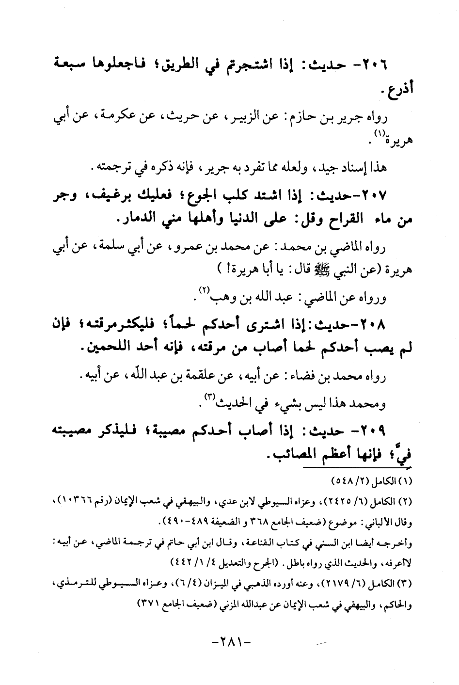 207 - حَدِيث: اذا اشْتَدَّ كلب الْجُوع؟ فَعَلَيْك برغيف، وجر من مَاء القراح وَقل: على الدُّنْيَا وَأَهْلهَا مني الدمار. رَوَاهُ الْمَاضِي بن مُحَمَّد: عَن مُحَمَّد بن عَمْرو، عَن أَبى سَلمَة، عَن أَبى هُرَيْرَة (عَن النَّبِي قَالَ: يَا أَبَا هُرَيْرَة!) وَرَوَاهُ عَن الماضى: عبد الله بن وهب.