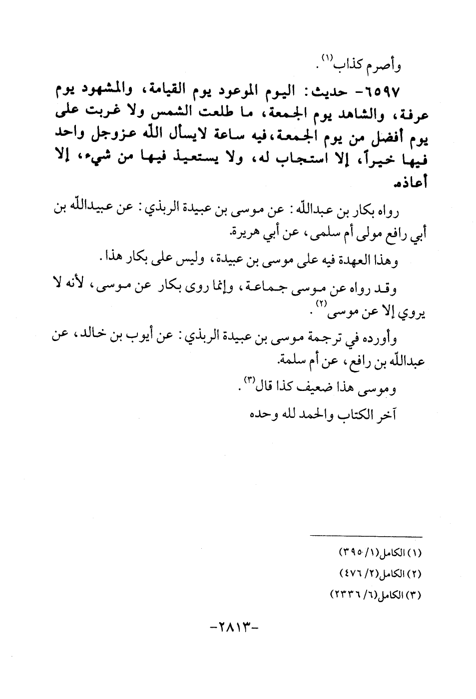 6597 - حَدِيث: الْيَوْم الْمَوْعُود يَوْم الْقِيَامَة، والمشهود يَوْم عَرَفَة، وَالشَّاهِد يَوْم الْجُمُعَة، مَا طلعت الشَّمْس وَلَا غَرِيب على يَوْم أفضل من يَوْم الْجُمُعَة، فِيهِ سَاعَة لَا يسْأَل الله عزوجل وَاحِد فِيهَا خيرا، إِلَّا اسْتَجَابَ لَهُ، وَلَا يستعيذ فِيهَا من شَيْء، إِلَّا أَعَاذَهُ. رَوَاهُ بكار بن عبد الله: عَن مُوسَى بن عُبَيْدَة الربذي: عَن عبيد الله بن أبي رَافع مولى أم سلمى، عَن أبي هُرَيْرَة. وَهَذَا الْعهْدَة فِيهِ على مُوسَى بن عُبَيْدَة، وَلَيْسَ على بكار هَذَا. وَقد رَوَاهُ عَن مُوسَى جمَاعَة، وَإِنَّمَا روى بكار عَن مُوسَى، لِأَنَّهُ لَا يروي إِلَّا عَن مُوسَى. وَأوردهُ فِي تَرْجَمَة مُوسَى بن عُبَيْدَة الربذي: عَن أَيُّوب بن خَالِد، عَن عبد الله بن رَافع، عَن أم سَلمَة. ومُوسَى هَذَا ضَعِيف كَذَا قَالَ. آخر الْكتاب وَالْحَمْد لله وَحده.