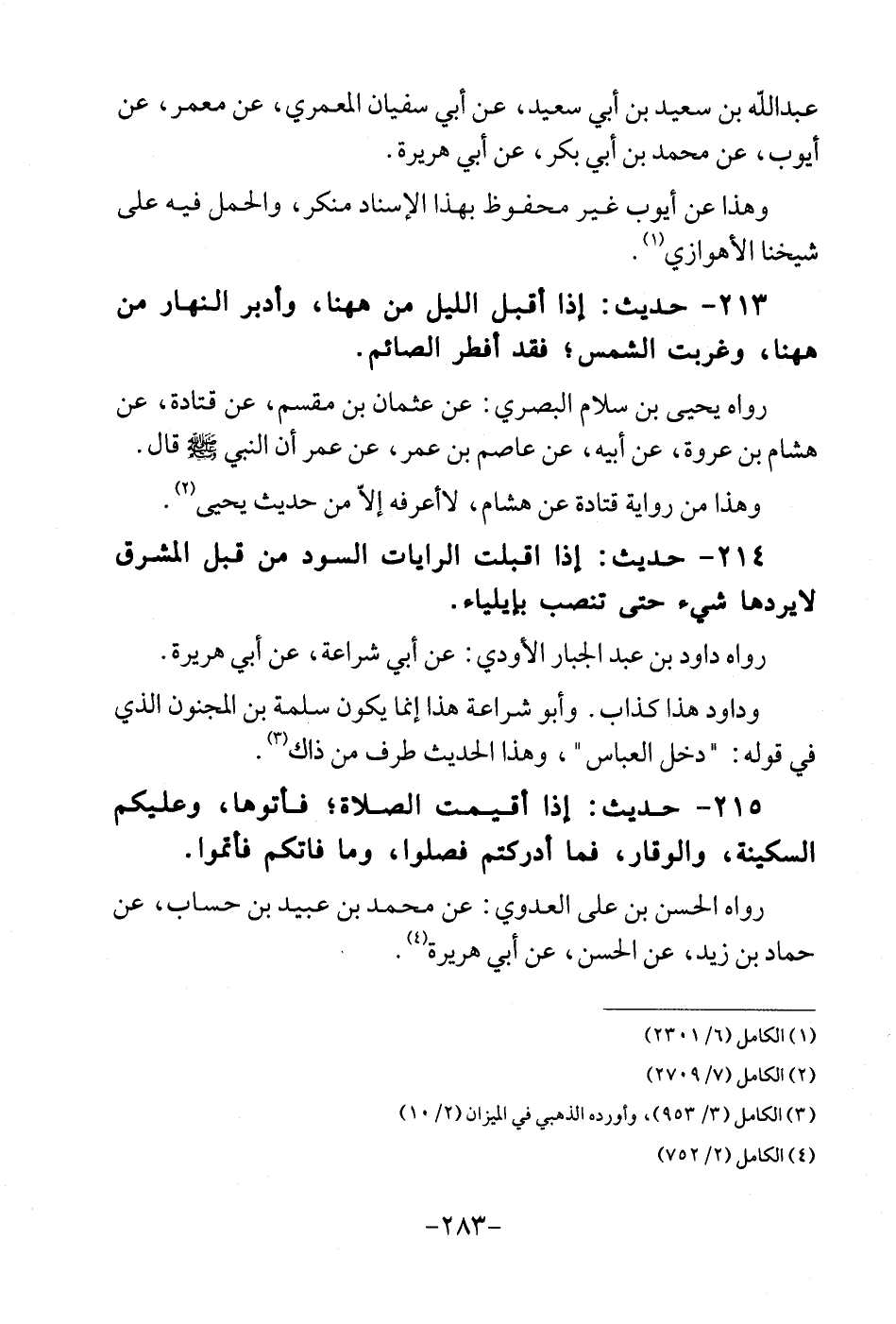215 - حَدِيث: إِذا أُقِيمَت الصَّلَاة؛ فأتوها، وَعَلَيْكُم السكينَة، وَالْوَقار، فَمَا أدركتم فصلوا، وَمَا فاتكم فاتموا. رَوَاهُ الْحسن بن على الْعَدوي: عَن مُحَمَّد بن عبيد بن حِسَاب، عَن حَمَّاد بن زيد، عَن الْحسن، عَن أبي هُرَيْرَة.