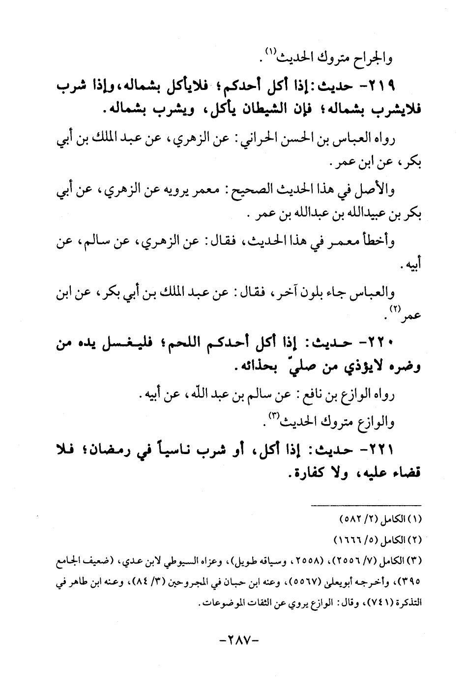 219 - حَدِيث: اذا أكل أحدكُم؛ فلايأكل بِشمَالِهِ، وَإِذا شرب فَلَا يشرب بِشمَالِهِ؛ فَإِن الشَّيْطَان يإكل، وَيشْرب بِشمَالِهِ. رَوَاهُ الْعَبَّاس بن الْحسن الْحَرَّانِي: عَن الزُّهْرِيّ، عَن عبد الْملك بن أبي بكر، عَن ابْن عمر. وَالْأَصْل فِي هَذَا الحَدِيث الصَّحِيح: معمر يرويهِ عَن الزُّهْرِيّ، عَن أبي بكر بن عبيد الله بن عبد الله بن عمر. وأخطا معمر فِي هَذَا الحَدِيث، فَقَالَ: عَن الزُّهْرِيّ، عَن سَالم، عَن أَبِيه. وَالْعَبَّاس جَاءَ بلون آخر، فَقَالَ: عَن عبد الْملك بن أبي بكر، عَن ابْن عمر.