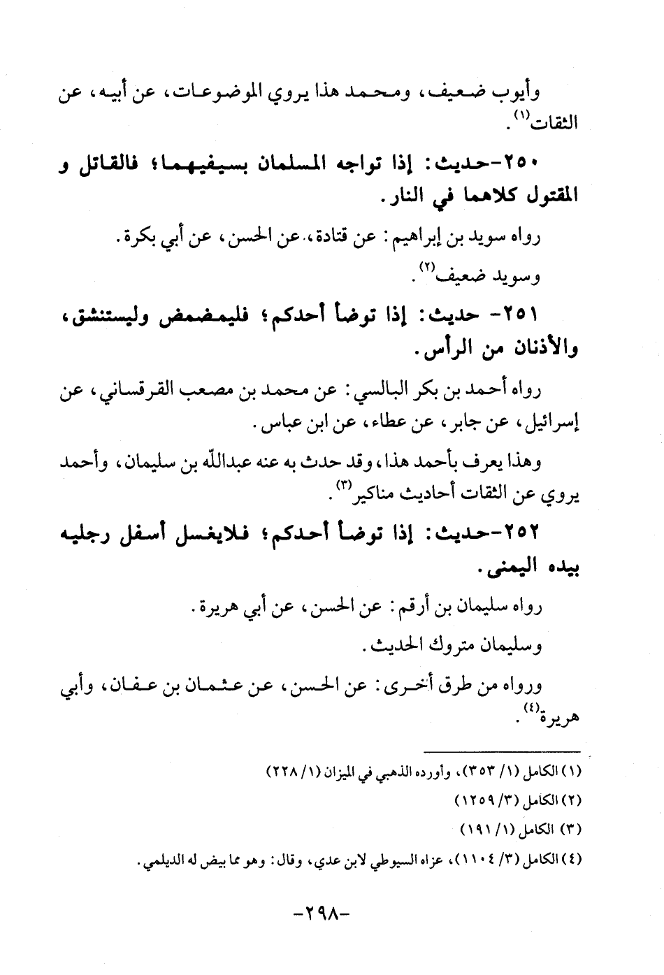 250 - حَدِيث: إِذا تواجه المسلمان بسيفيهما؛ فالقانل والمقتول كِلَاهُمَا فِي النَّار. رَوَاهُ سُوَيْد بن إِبْرَاهِيم: عَن قَتَادَة، عَن الْحسن، عَن أبي بكرَة. وسُويد ضَعِيف.