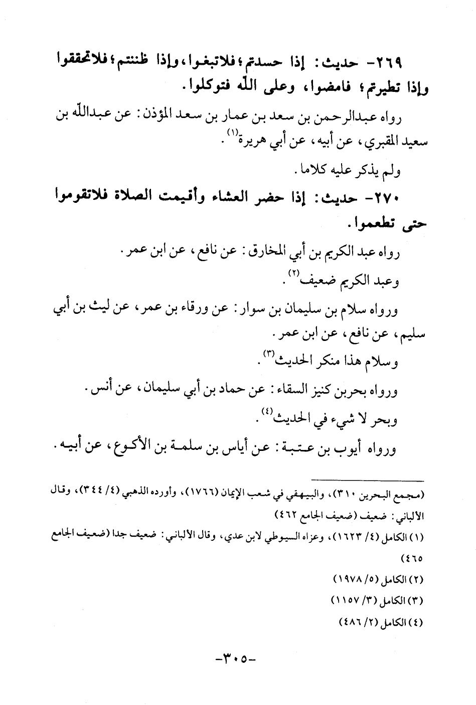 270 - حَدِيث: إِذا حضر الْعشَاء وأقيمت الصَّلَاة فلاتقوموا حَتَّى تطعموا. رَوَاهُ عبد الْكَرِيم بن أبي الْمخَارِق: عَن نَافِع، عَن ابْن عمر. وَعبد الْكَرِيم ضَعِيف. وَرَوَاهُ سَلام بن سُلَيْمَان بن سوار: عَن وَرْقَاء بن عمر، عَن لَيْث بن أبي سليم، عَن نَافِع، عَن ابْن عمر. وَسَلام هَذَا مُنكر الحَدِيث. وَرَوَاهُ بَحر بن كنيز السقاء: عَن حَمَّاد بن أبي سُلَيْمَان، عَن أنس. وبحر لَا شَيْء فِي الحَدِيث. وَرَوَاهُ أَيُّوب بن عتبَة: عَن أياس بن سَلمَة بن الْأَكْوَع، عَن أَبِيه.