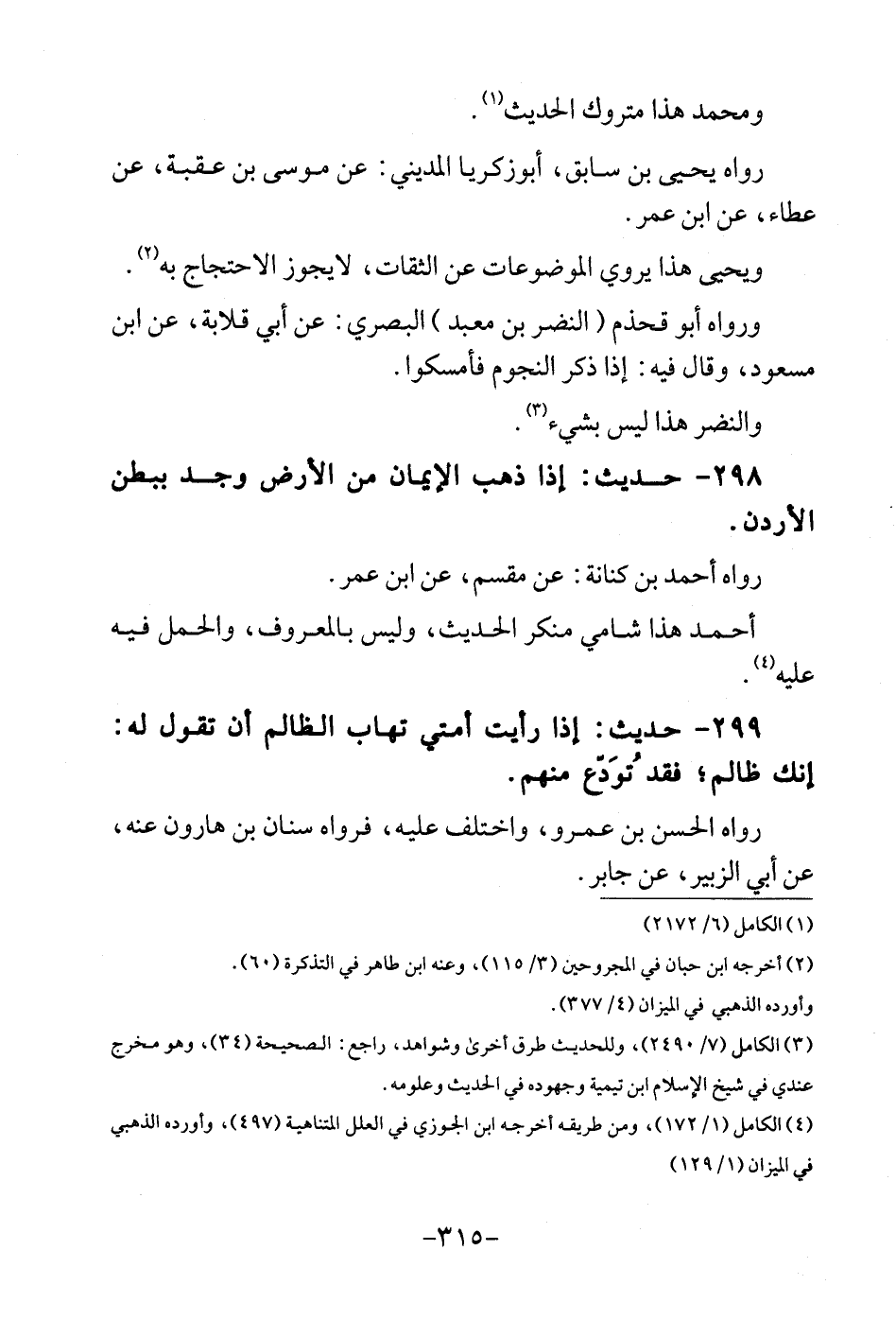 298 - حَدِيث: إِذا ذهب الْإِيمَان من الأَرْض وجد بِبَطن الأرد ن. رَوَاهُ أَحْمد بن كنَانَة: عَن مقسم، عَن ابْن عمر. أَحْمد هَذَا شَامي مُنكر الحَدِيث، وَلَيْسَ بِالْمَعْرُوفِ، وَالْحمل فِيهِ عَلَيْهِ.