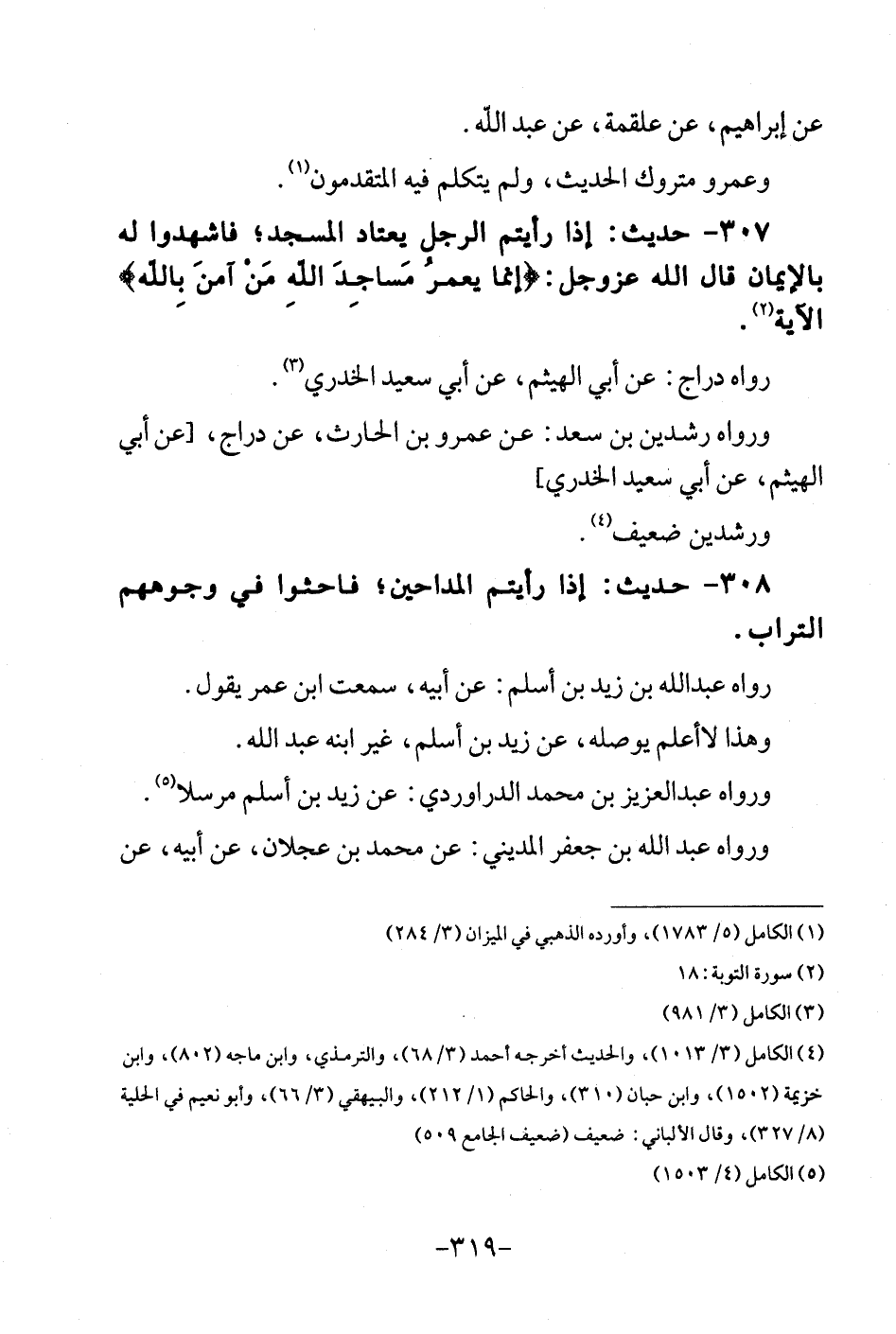 307 - حَدِيث: إِذا رَأَيْتُمْ الرجل يعْتَاد الْمَسْجِد؛ فَاشْهَدُوا لَهُ بِالْإِيمَان قَالَ الله عزرجل: (إِنَّمَا يعمرُ مَساجِدَ اللهِ مَنْ آمنَ بِالله (الْآيَة. رَوَاهُ دراج: عَن أبي الْهَيْثَم، عَن أبي سعيد الْخُدْرِيّ. وَرَوَاهُ رشدين بن سعد: عَن عَمْرو بن الْحَارِث، عَن دراج، [عَن أبي الْهَيْثَم، عَن أبي سعيد الْخُدْرِيّ] . وَرشْدِين ضَعِيف.