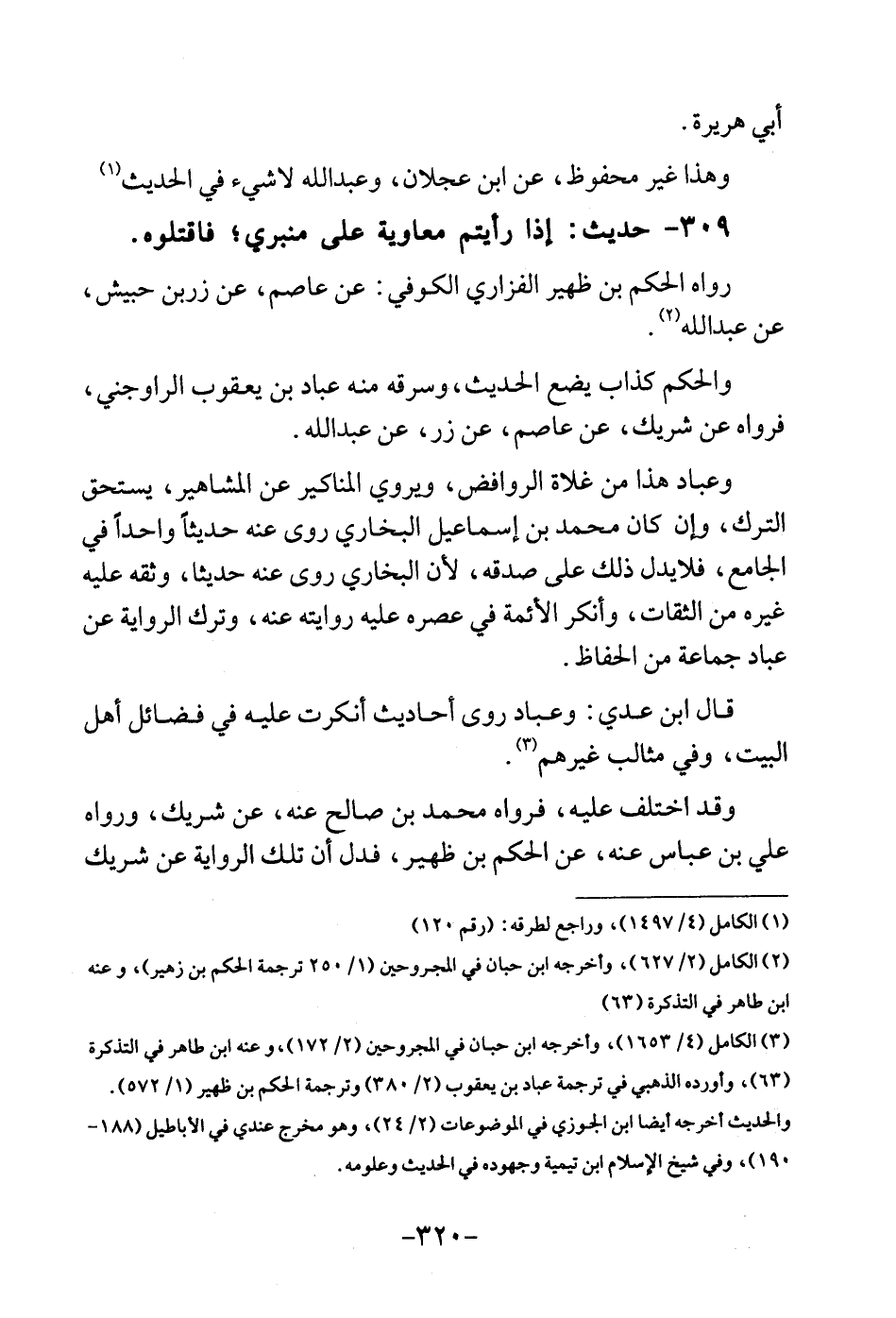 أبي هُرَيْرَة. وَهَذَا غير مَحْفُوظ، عَن ابْن عجلَان، وعبد الله لاشيء فِي الحَدِيث. 309 - حَدِيث: إِذا رَأَيْتُمْ مُعَاوِيَة على منبرى؛ فَاقْتُلُوهُ. رَوَاهُ الحكم بن ظهير الْفَزارِيّ الْكُوفِي: عَن عَاصِم، عَن زربن حُبَيْش، عَن عبد الله. وَالْحكم كَذَّاب يضع الحَدِيث، وَسَرَقَهُ مِنْهُ عباد بن يَعْقُوب الراوجني، فَرَوَاهُ عَن شريك، عَن عَاصِم، عَن زر، عَن عبد الله. وَعباد هَذَا من غلاة الروافض، ويروي الْمَنَاكِير عَن الْمَشَاهِير، يسْتَحق التّرْك، وَإِن كَانَ مُحَمَّد بن إِسْمَاعِيل البُخَارِيّ روى عَنهُ حَدِيثا وَاحِدًا فِي الْجَامِع، فلايدل ذَلِك على صدقه، لِأَن البُخَارِيّ روى عَنهُ حَدِيثا، وَثَّقَهُ عَلَيْهِ غَيره من الثِّقَات، وَأنكر الْأَئِمَّة فِي عصره عَلَيْهِ رِوَايَته عَنهُ، وَترك الرِّوَايَة عَن عباد جمَاعَة من الْحفاظ. قَالَ ابْن عدي: وَعباد روى أَحَادِيث أنْكرت عَلَيْهِ فِي فَضَائِل أهل الْبَيْت، وَفِي مثالب غَيرهم. وَقد اخْتلف عَلَيْهِ، فَرَوَاهُ مُحَمَّد بن صَالح عَنهُ، عَن شريك، وَرَوَاهُ عَليّ بن عَبَّاس عَنهُ، عَن الحكم بن ظهير، فَدلَّ أَن تِلْكَ الرِّوَايَة عَن شريك
