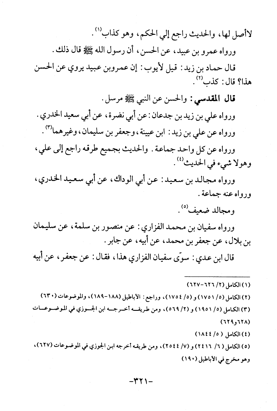 لَا أصل لَهَا، والْحَدِيث رَاجع إِلَيّ الحكم، وَهُوَ كَذَّاب. وَرَوَاهُ عَمْرو بن عبيد، عَن الْحسن، أَن رَسُول الله - صلى الله عَلَيْهِ وَسلم - قَالَ ذَلِك. قَالَ حَمَّاد بن زيد: قيل لأيوب: إِن عمروبن عبيد يروي عَن الْحسن هَذَا؟ قَالَ: كذب. قَالَ الْمَقْدِسِي: وَالْحسن عَن النَّبِي - صلى الله عَلَيْهِ وَسلم - مُرْسل. وَرَوَاهُ عَليّ بن زيد بن جدعَان: عَن أبي نَضرة، عَن أبي سعيد الْخُدْرِيّ. وَرَوَاهُ عَن عَليّ بن زيد: ابْن عُيَيْنَة، وجعفر بن سُلَيْمَان، وَغَيرهمَا. وَرَوَاهُ عَن كل وَاحِد جمَاعَة. والْحَدِيث بِجَمِيعِ طرقه رَاجع إِلَى عَليّ، وَهُوَ لَا شَيْء فِي الحَدِيث. وَرَوَاهُ مجَالد بن سعيد: عَن أبي الوداك، عَن أبي سعيد الْخُدْرِيّ، وَرَوَاهُ عَنهُ جمَاعَة. ومجالد ضَعِيف. وَرَوَاهُ سُفْيَان بن مُحَمَّد الْفَزارِيّ: عَن مَنْصُور بن سَلمَة، عَن سُلَيْمَان بن بِلَال، عَن جَعْفَر بن مُحَمَّد، عَن أَبِيه، عَن جَابر. قَالَ ابْن عدي: سوّى سُفْيَان الْفَزارِيّ هَذَا، فَقَالَ: عَن جَعْفَر، عَن أَبِيه