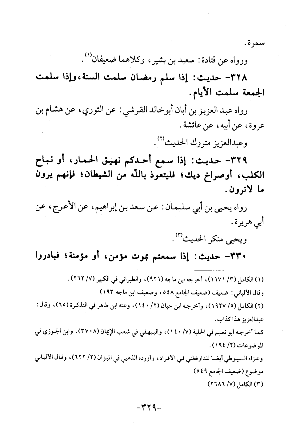 329 - حَدِيث: إِذا سمع أحدكُم نهيق الْحمار، أَو نباح الْكَلْب، أوصراخ ديك؛ فليتعوذ بِاللَّه من الشَّيْطَان؛ فَإِنَّهُم يرَوْنَ مَا لَا تررن. رَوَاهُ يحى بن أبي سُلَيْمَان: عَن سعد بن إِبْرَاهِيم، عَن الْأَعْرَج، عَن أبي هُرَيْرَة. وَيحيى مُنكر الحَدِيث.