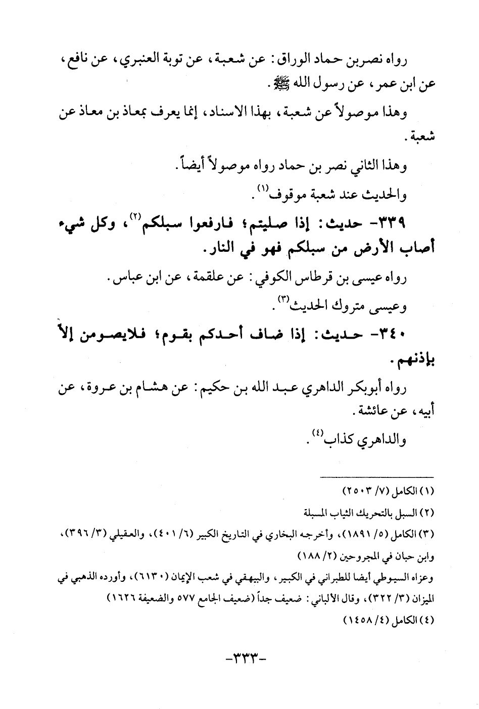 339 - حَدِيث: اذا صليتم؛ فارفعرا سبلكم، وكل شَيْء أصَاب الأَرْض من سبلكم فَهُوَ فِي النَّار. رَوَاهُ عِيسَى بن قرطاس الْكُوفِي: عَن عَلْقَمَة، عَن ابْن عَبَّاس. وَعِيسَى مَتْرُوك الحَدِيث.