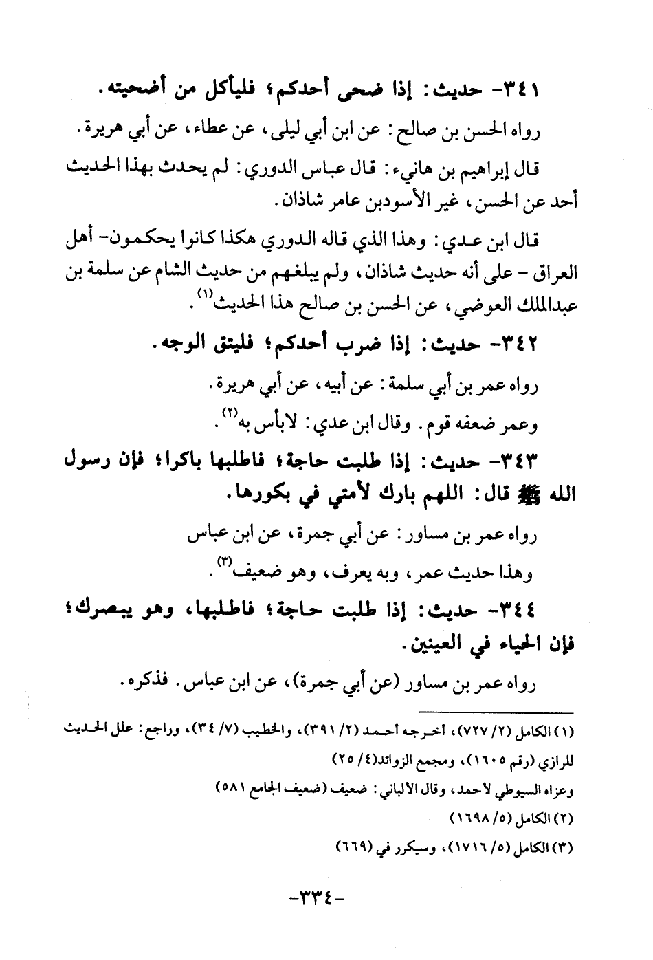 341 - حَدِيث: اذا ضحى أحدكُم؛ فَليَأْكُل من أضحيته. رَوَاهُ الْحسن بن صَالح: عَن ابْن أبي ليلى، عَن عَطاء، عَن أبي هُرَيْرَة. قَالَ إِبْرَاهِيم بن هَانِيء: قَالَ عَبَّاس الدوري: لم يحدث بِهَذَا الحَدِيث أحد عَن الْحسن، غير الْأسود بن عَامر شَاذان. قَالَ ابْن عدي: وَهَذَا الَّذِي قَالَه الدوري هَكَذَا كَانُوا يحكمون - أهل الْعرَاق - على أَنه حَدِيث شأذان، وَلم يبلغهم من حَدِيث الشَّام عَن سَلمَة بن عبد الملك العوضي، عَن الْحسن بن صَالح هَذَا الحَدِيث. 342 - حَدِيث: اذا ضرب أحدكُم، فليتق الْوَجْه. رَوَاهُ عمر بن أبي سَلمَة: عَن أَبِيه، عَن أبي هُرَيْرَة. وَعمر ضعفه قوم. وَقَالَ ابْن عدي: لابأس بِهِ.