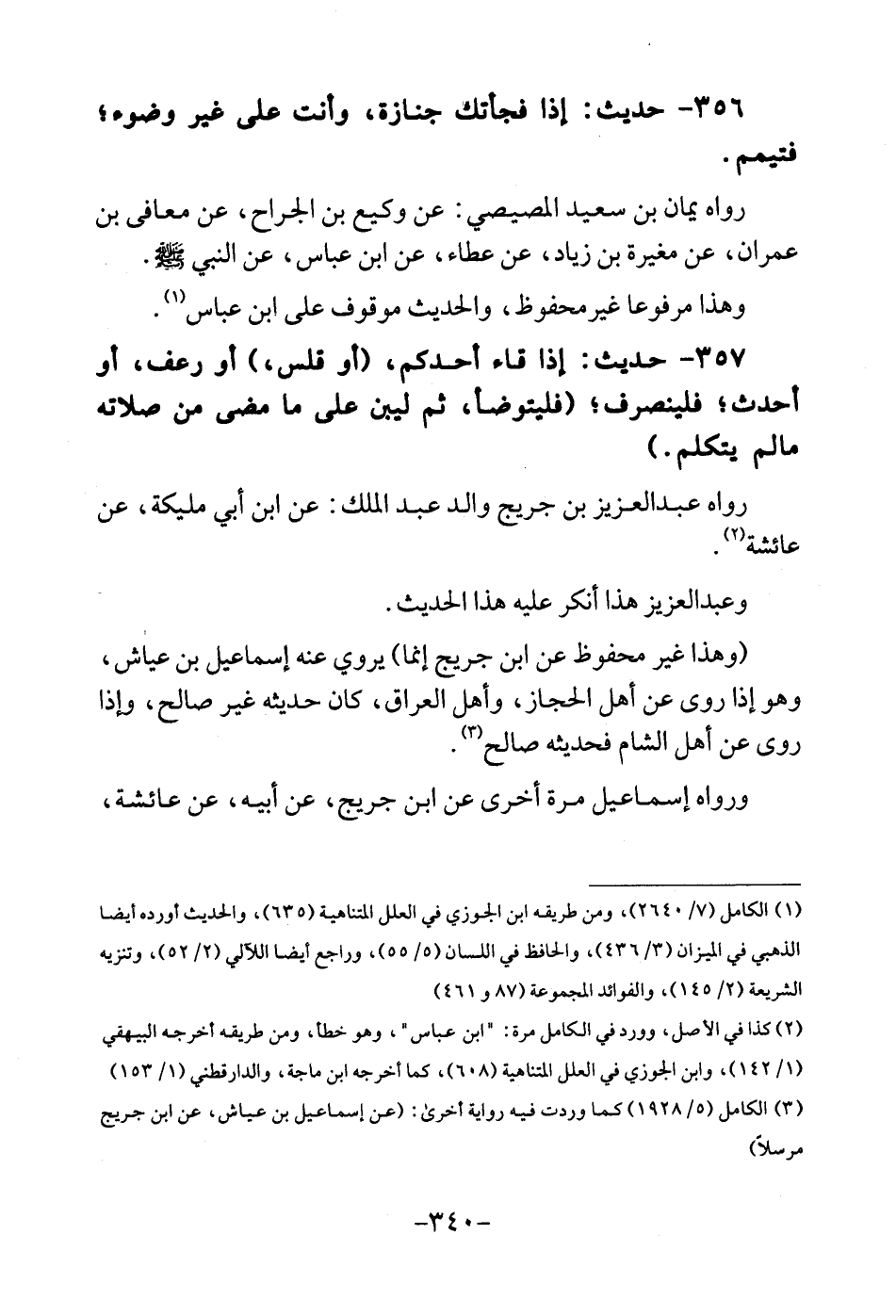 357 - حَدِيث: اذا قاء أحدكُم، (أَو قلس،) أَو رعف، أَو أحدث؛ فلينصرف؛ (فَليَتَوَضَّأ، ثمَّ ليبن على مَا مضى من صلَاته مالم يتَكَلَّم) . رَوَاهُ عبد العزيز بن جريج وَالِد عبد الْملك: عَن ابْن أبي مليكَة، عَن عَائِشَة. وعبد العزيز هَذَا أنكر عَلَيْهِ هَذَا الحَدِيث. (وَهَذَا غير مَحْفُوظ عَن ابْن جريج إِنَّمَا) يروي عَنهُ إِسْمَاعِيل بن عَيَّاش، وَهُوَ إِذا روى عَن أهل الْحجاز، وَأهل الْعرَاق، كَانَ حَدِيثه غير صَالح، وَإِذا روى عَن أهل الشَّام فَحَدِيثه صَالح. وَرَوَاهُ إِسْمَاعِيل مرّة أُخْرَى عَن ابْن جريج، عَن أَبِيه، عَن عَائِشَة،